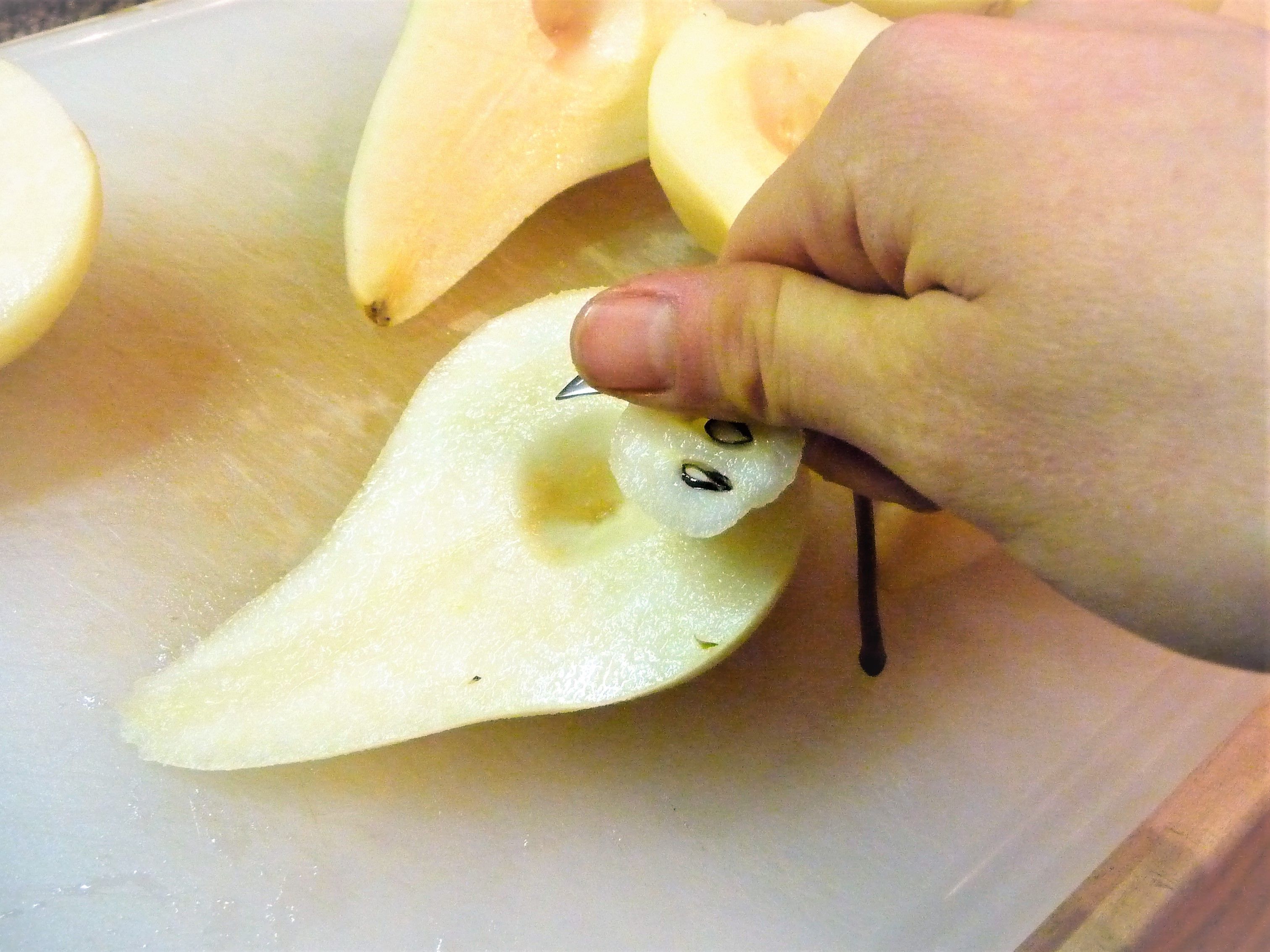 Bird’s Beak Knife: This knife has a short, curved blade shaped like a bird’s beak. It is helpful for removing the core of the pear in this recipe. It’s also helpful for trimming artichokes.