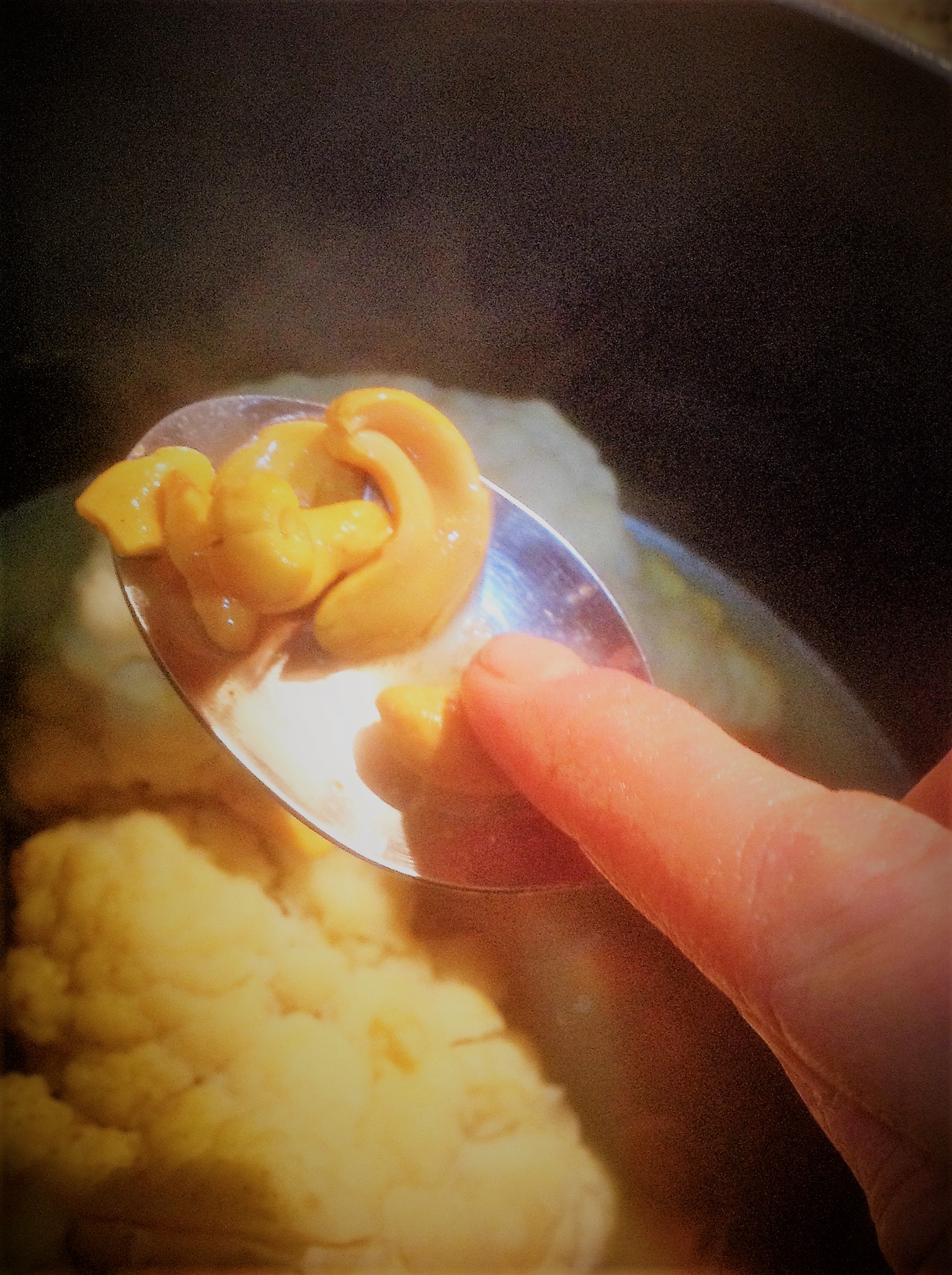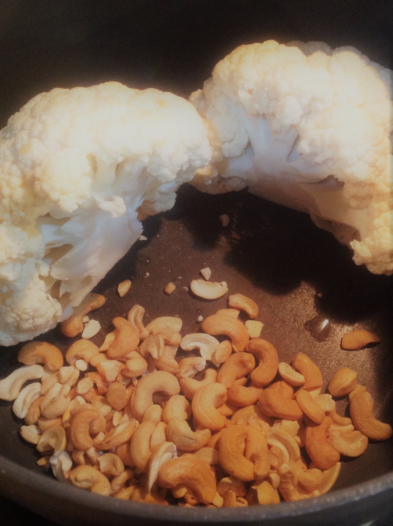To make the soup: In a medium pot, combine the cauliflower, cashews, Curry spice, ginger, and water. Cover and bring to a boil. Reduce to simmer. Simmer until the cashews are soft, about 20 minutes.