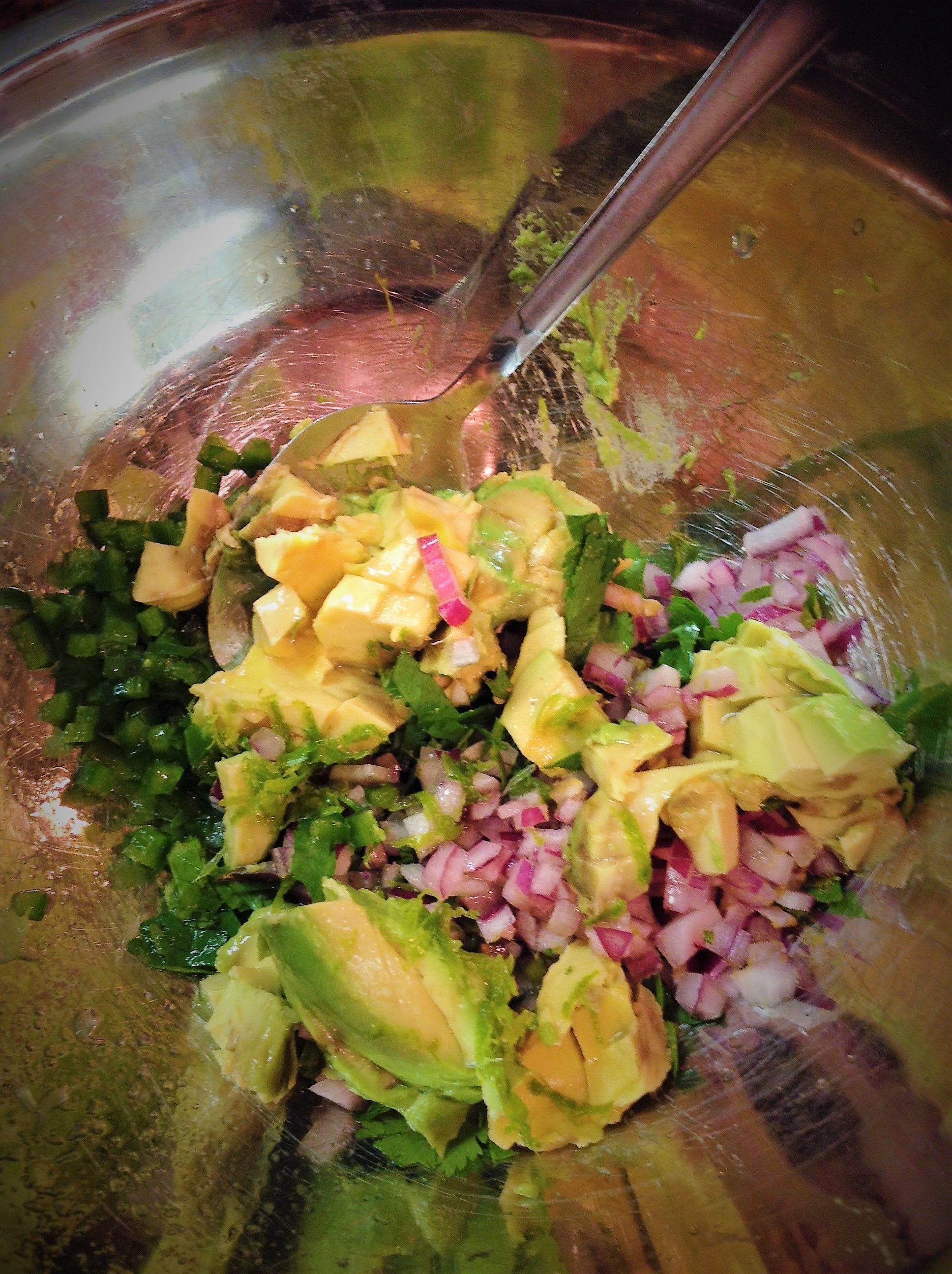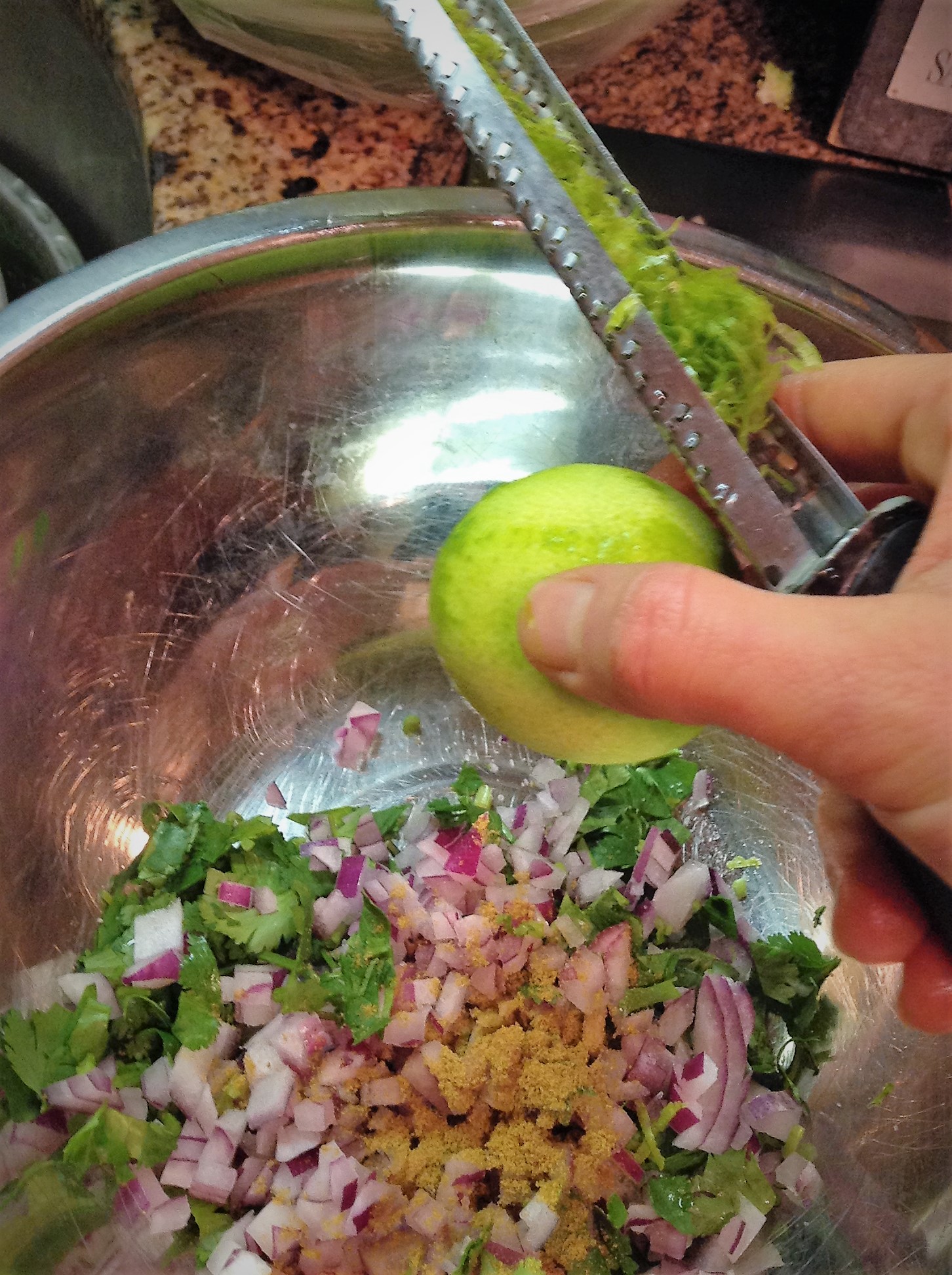 To Make the 5 Minute Guacamole: In a small bowl, combine the red onion, jalapeno, cumin, lime zest and juice, and salt. Let sit while you prepare the other ingredients, just a 1 minute or 2.