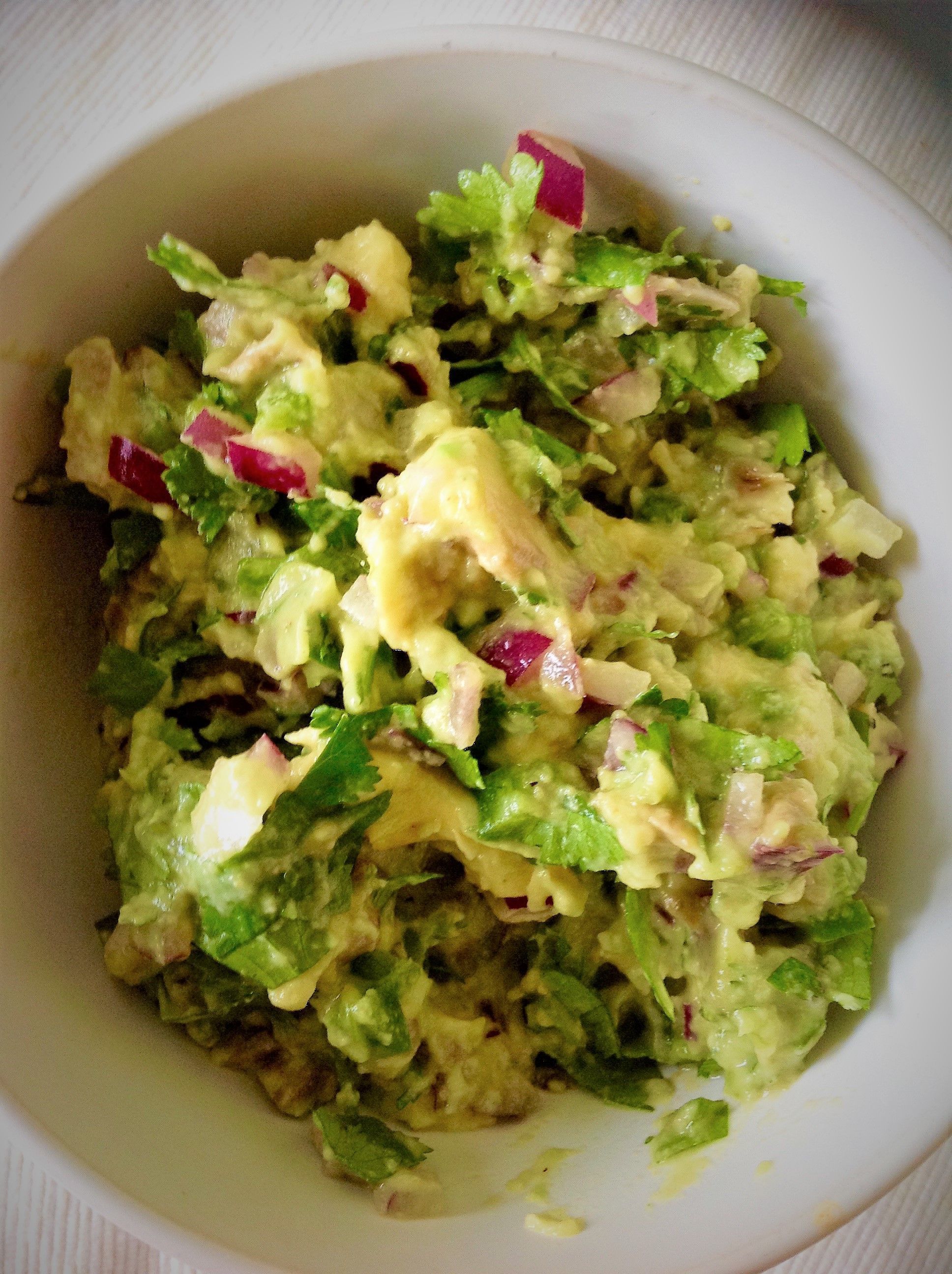Add the diced tomatoes and cilantro. Carefully halve the avocado, remove the pit, and scrape out the avocado flesh. Use a fork to mash everything together. Taste to adjust seasoning