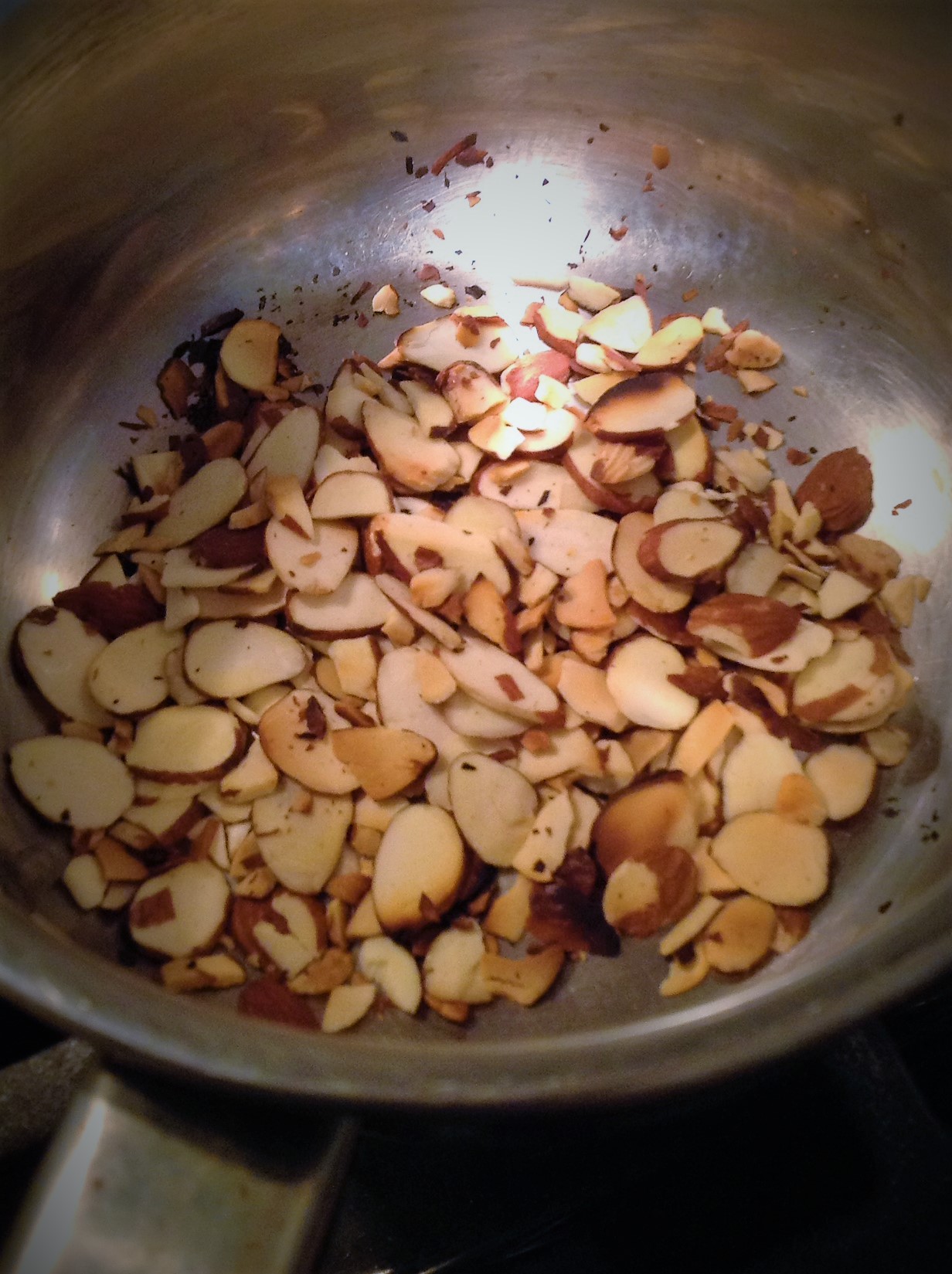 To toast the almonds: Place the almonds in a small, dry pot. Cover and cook over medium-low heat, shaking the pot often, until lightly browned, only about 4-5 minutes. Remove from the pot and reserve for later. Place the pot back on the stove.