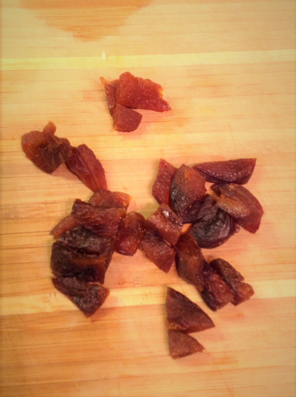 To cook the Whole Wheat Couscous: Chop the apricot. Peel and dice the carrot. Place the apricot and carrot into the small pot, along with the 1 1/4 cup of water. Cover and bring to a boil.
