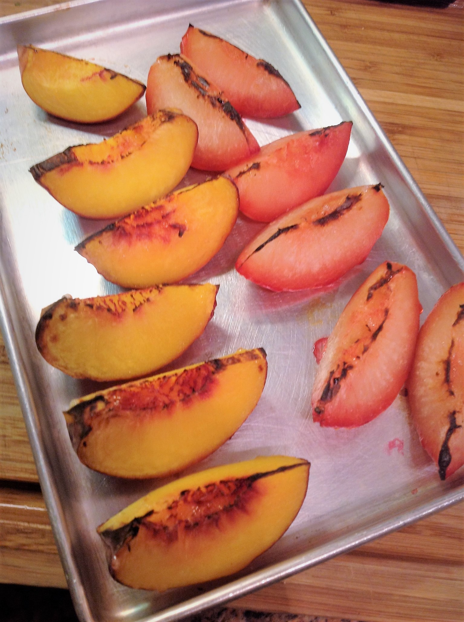 To Broil the Stone Fruit: Preheat your oven to Broiler setting, “Hi”. Remove the pits of the fruit and cut into large wedges. Place the fruit, cut-side-up, on a baking sheet. Place in the oven, on the top rack, right under the broiler. Broil for 5-6 minutes.