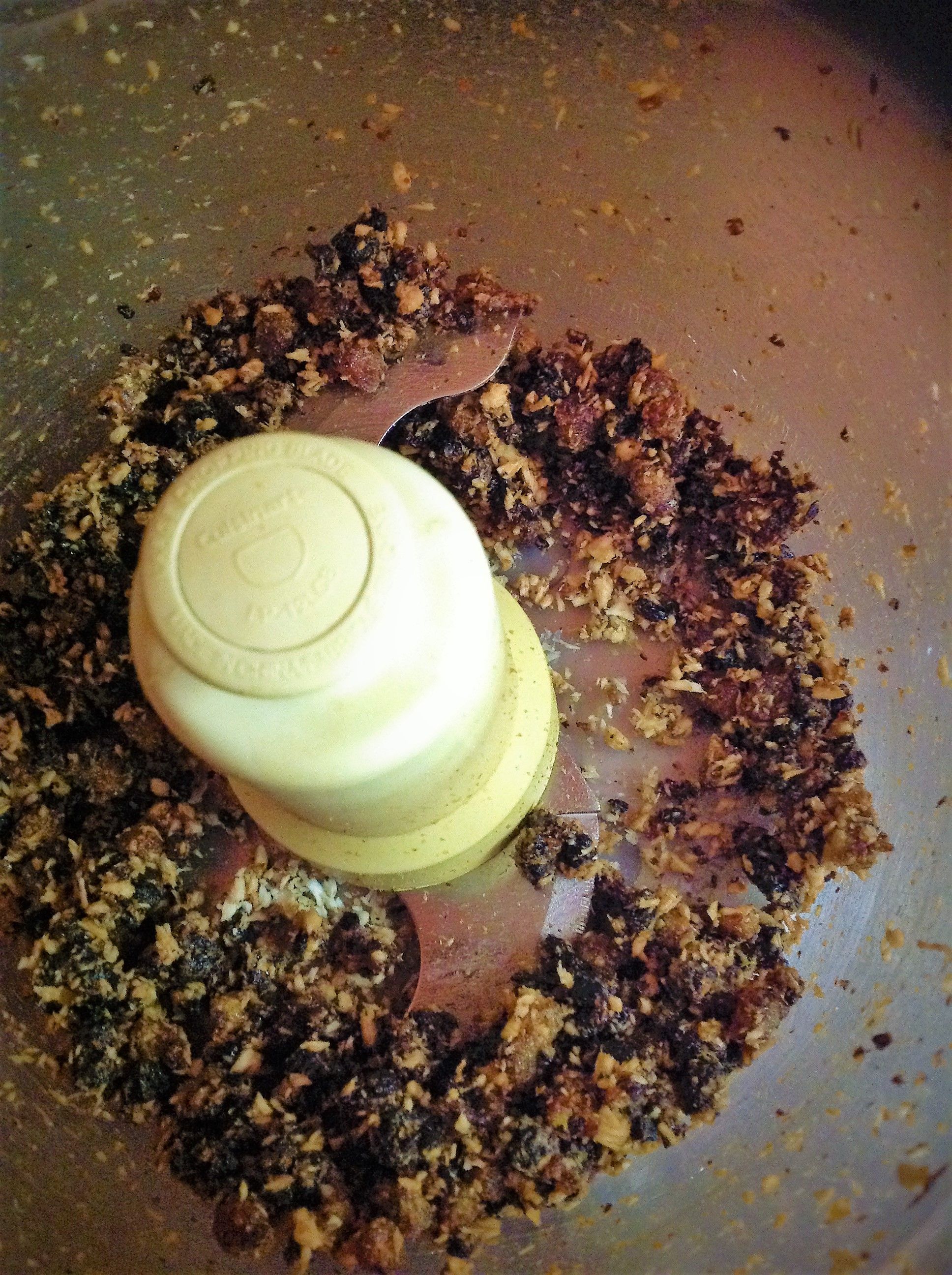 Place the coconut, cherries, and dates to the food processor. Puree until crumbly, about the same size as the cashew pecan mix. Add chopped cherry mix to the flax egg bowl.