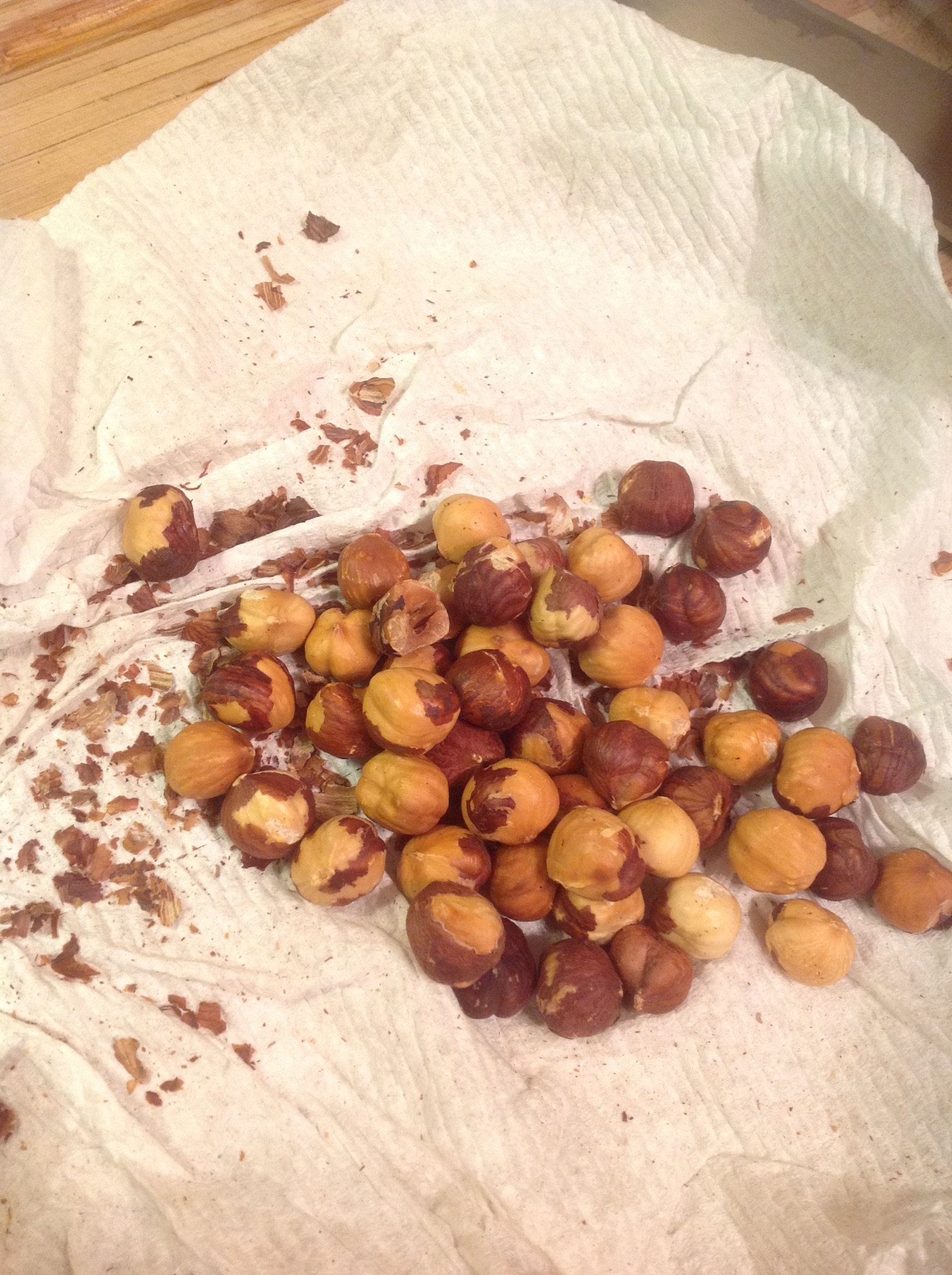 To make the Chocolate Hazelnut Vegan New-Tella: When the nuts are cool enough to handle, place the hazelnuts in a clean dish towel or paper towel. Roll around to peel off the skins. The skins are bitter so remove as much as you can