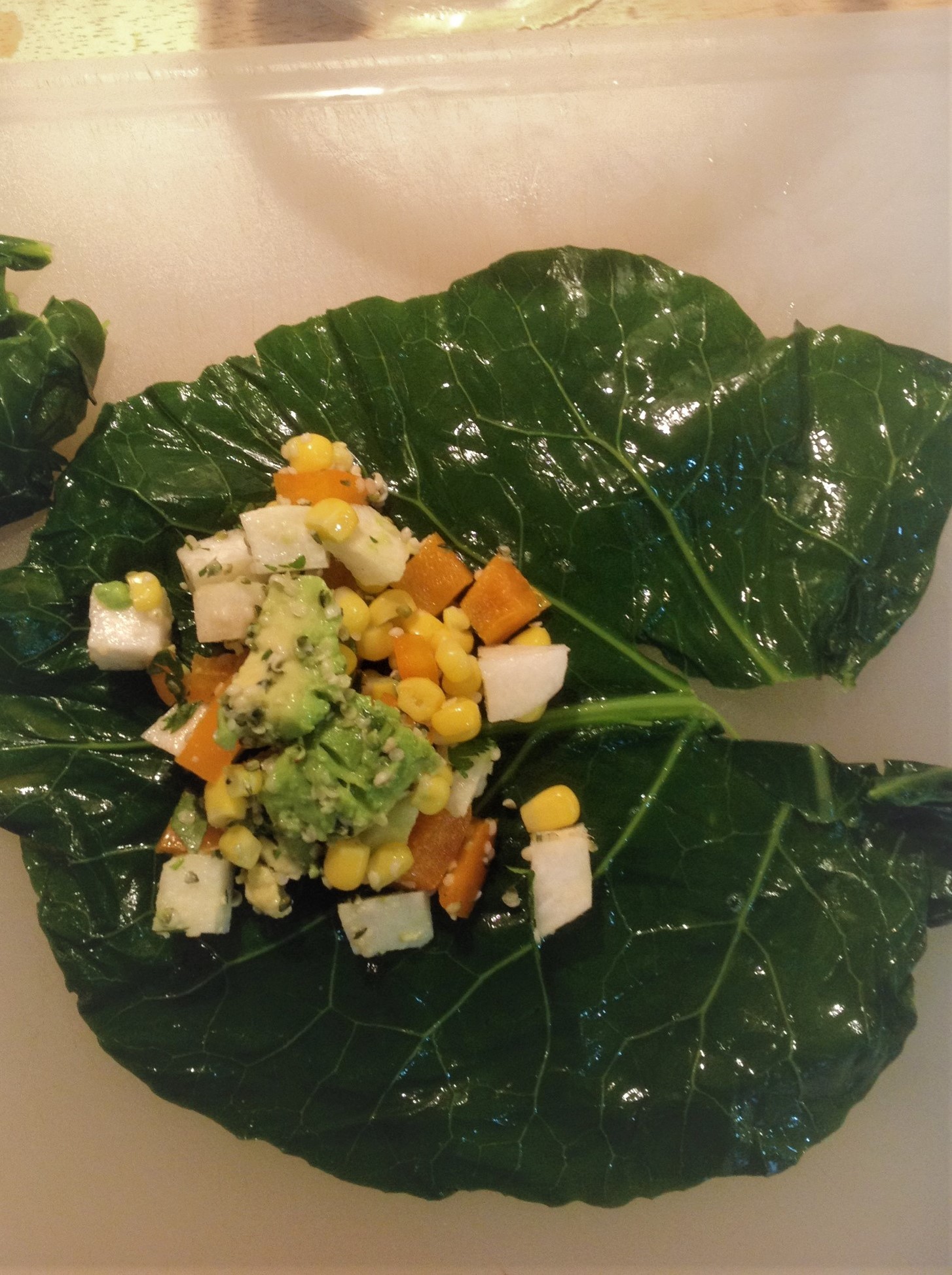Raw version: You can make a raw version of this recipe by using raw collard leaves. Skip the step of steaming the collard leaves. Instead of frozen corn, use fresh corn on the cob, cut off the ear. 1 ear of corn yields about 1 cup kernels so youโll need one ear of corn for this recipe.