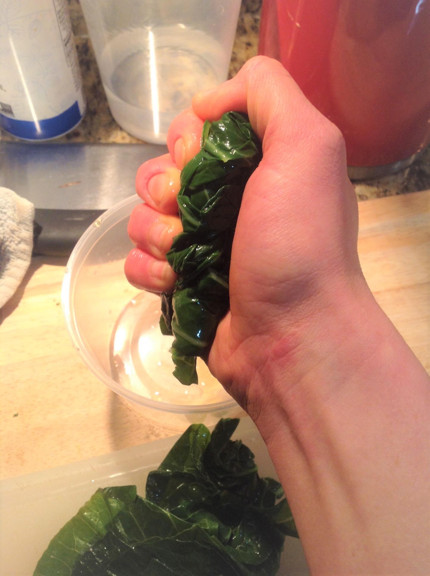 When the collards have cooled, drain them from the ice bath. Use your hands to squeeze out as much water as you can.