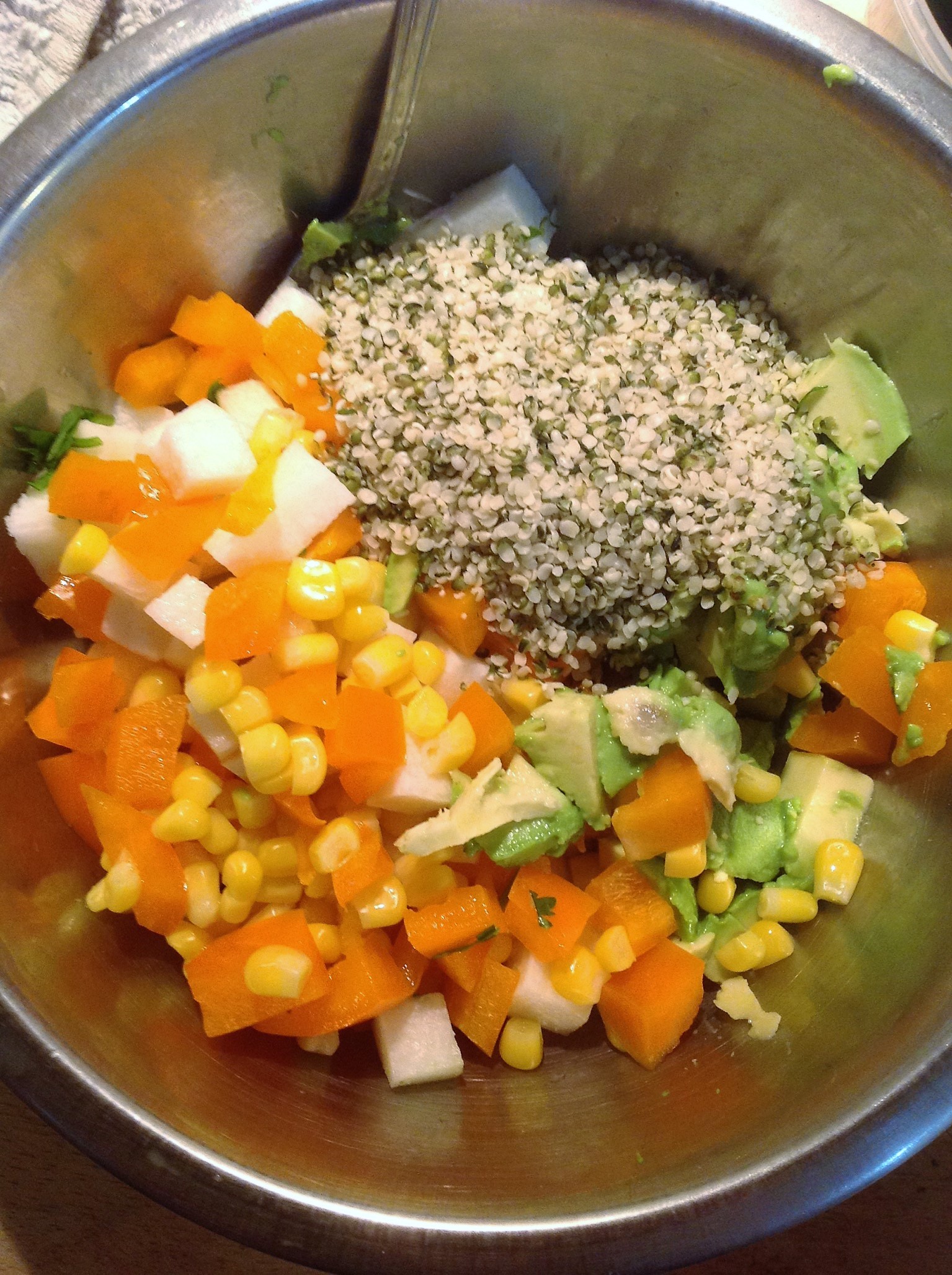 While the collards steam and cool, work on the ingredients for Fiesta Hemp Seed filling.