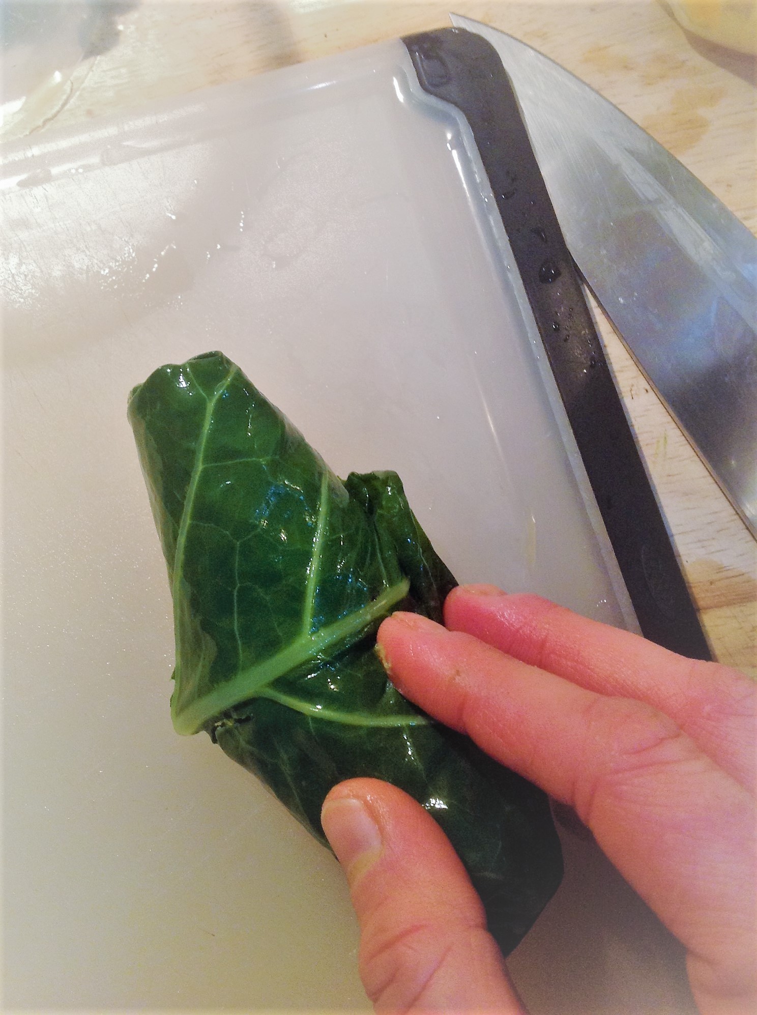 Place about an inch of water in a wide pot and bring to boil over high heat. Use a paring knife to cut out the woody stalk of the collard leaves, trying not to cut too deeply into the leaves. The bigger the collard leaves, the better.
