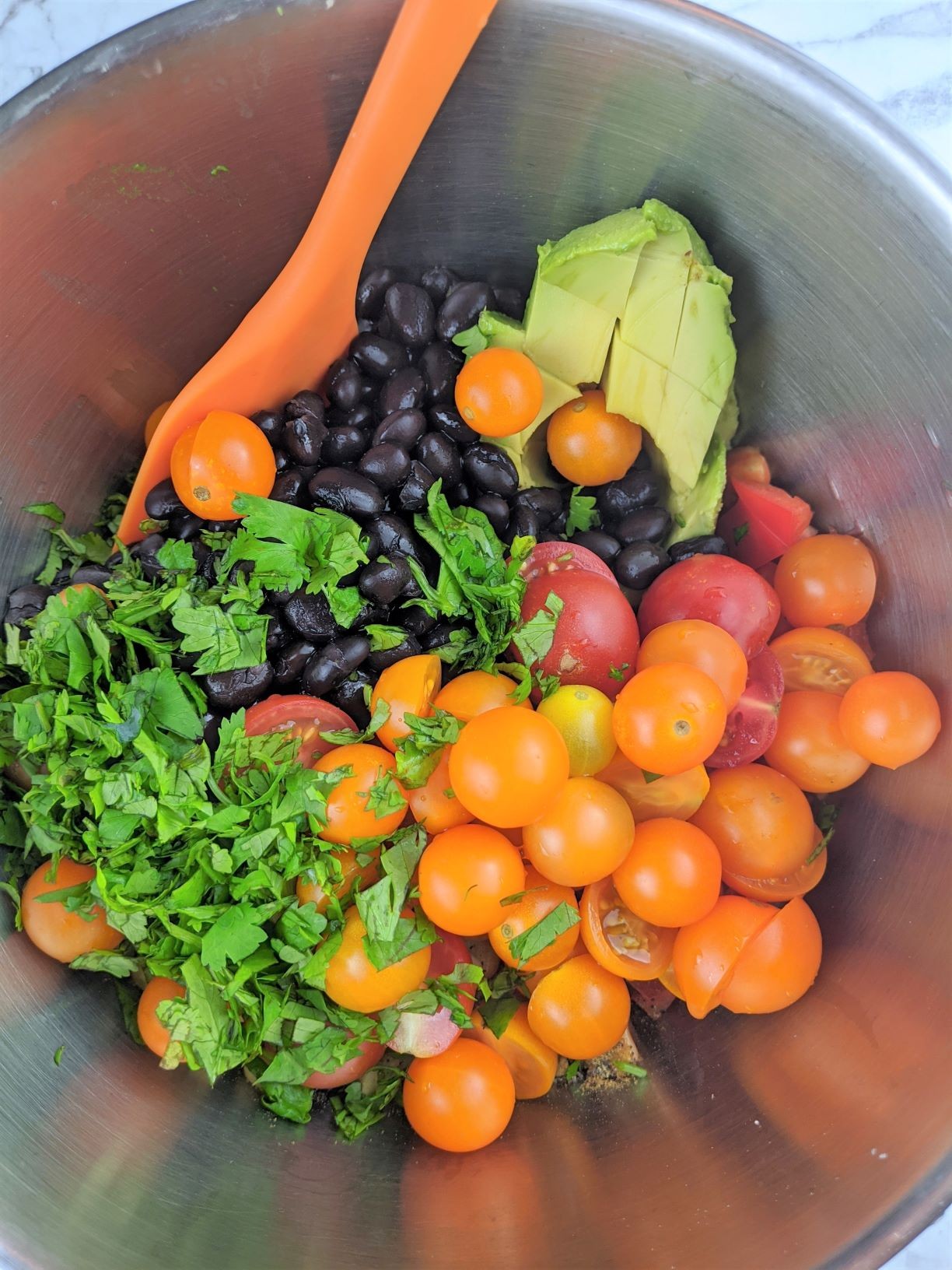 Sweet corn plays balances the hearty texture of black beans. Red bell pepper and red onion add crunchy bites. Fresh lime juice and cilantro add brightness. Creamy avocado adds a cooling flavor. Then, ground cumin and minced jalapeno provide Southwest flair.
