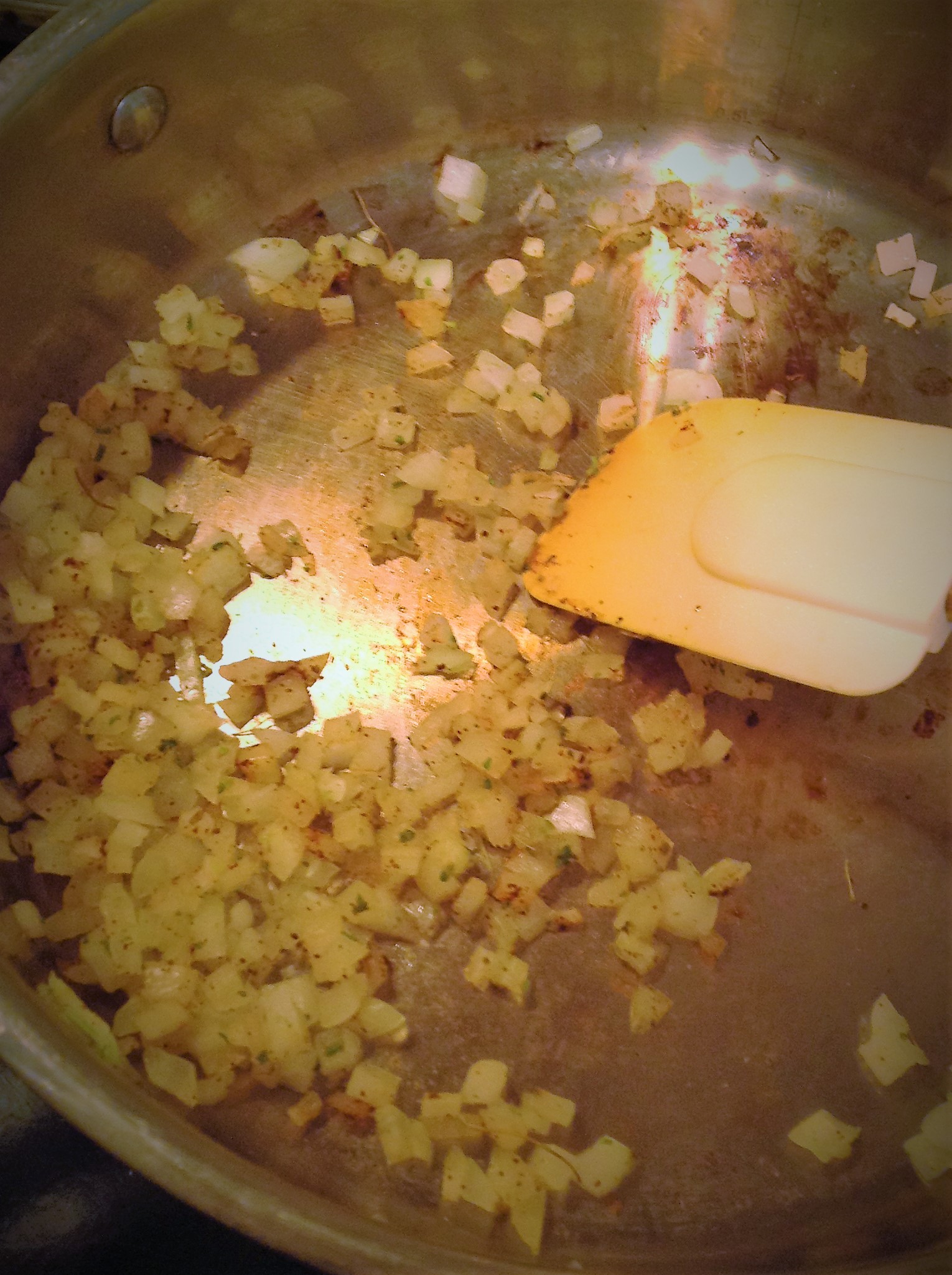 To flavor the cakes: In a wide pan, cook the onion, cumin, chili powder, and marjoram, covered, over medium heat. You want the onions to sweat and the spices to become aromatic. This should only take about 5 minutes.