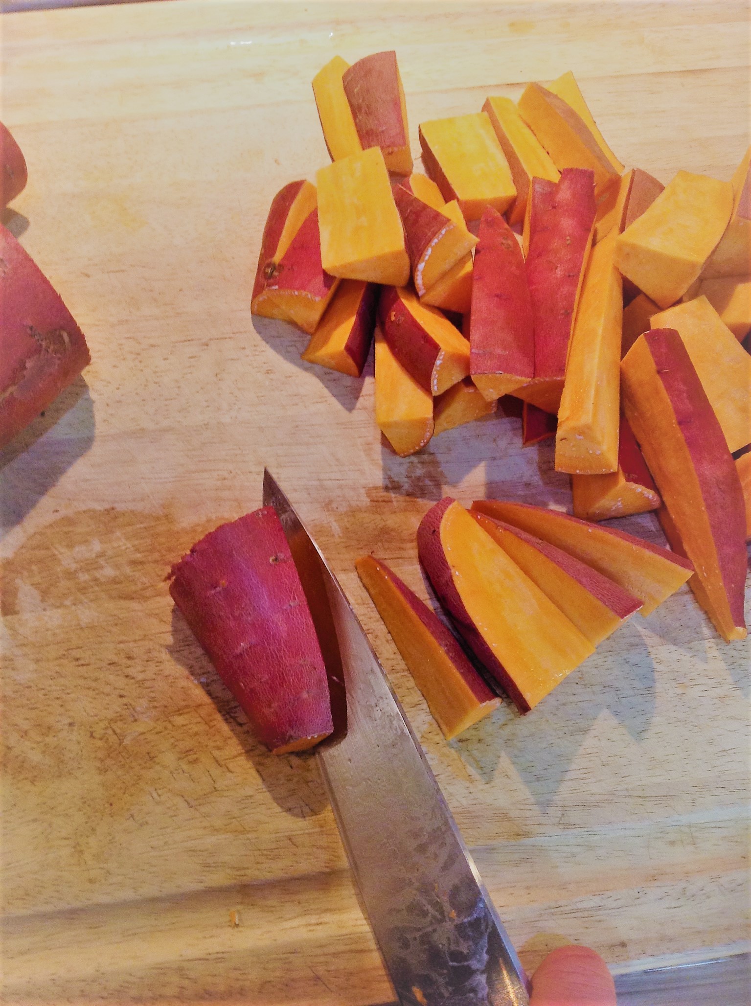 To make the Oil-Free Roasted Sweet Potato wedges: Scrub the sweet potatoes. Cut into 2 to 3 inch long pieces. Cut these pieces in half, lengthwise. Angle your knife to cut the pieces into wedges, about 1-2 inches thick.
