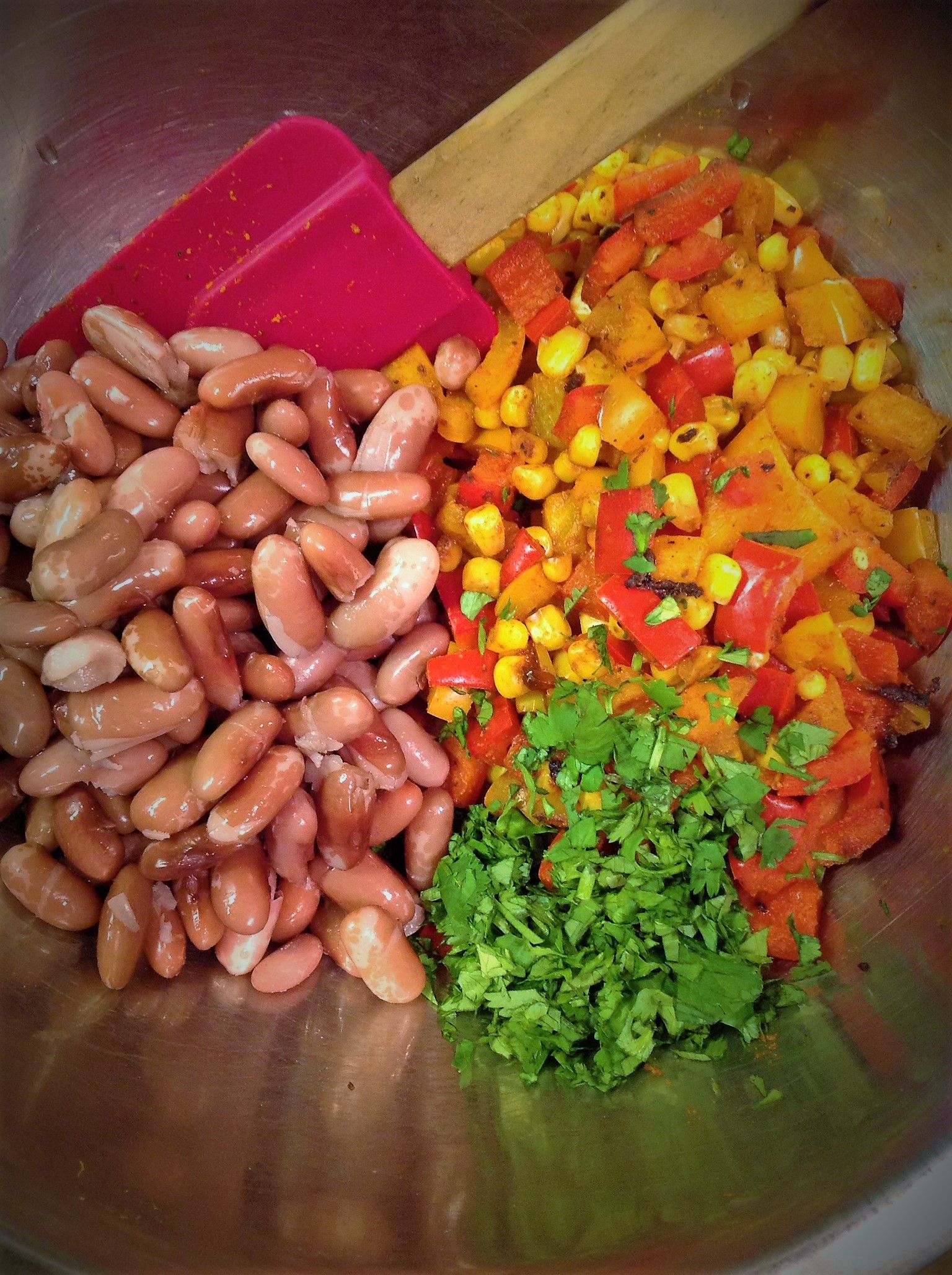 In a large bowl, combine the cooked beans, bell pepper mixture, cilantro, and lime. Season with salt and pepper. Toss well to combine. Taste to adjust seasoning.