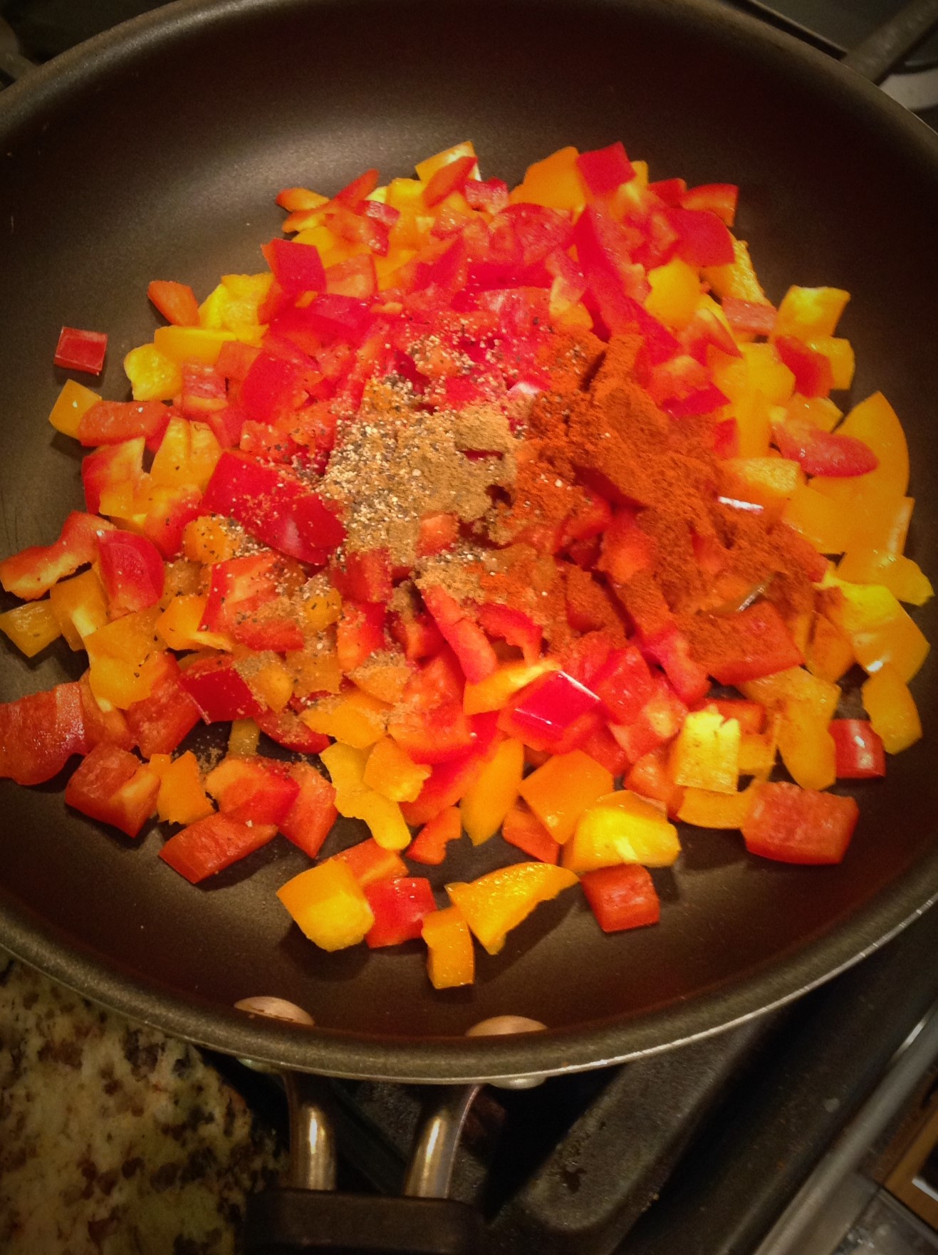 Add the diced peppers, paprika, cumin, and dash of black pepper to the hot sauté pan. Sauté, stirring often, for about 5-7 minutes, until the peppers are soft and the spices are aromatic. Add the corn and cook for another 2 minutes.