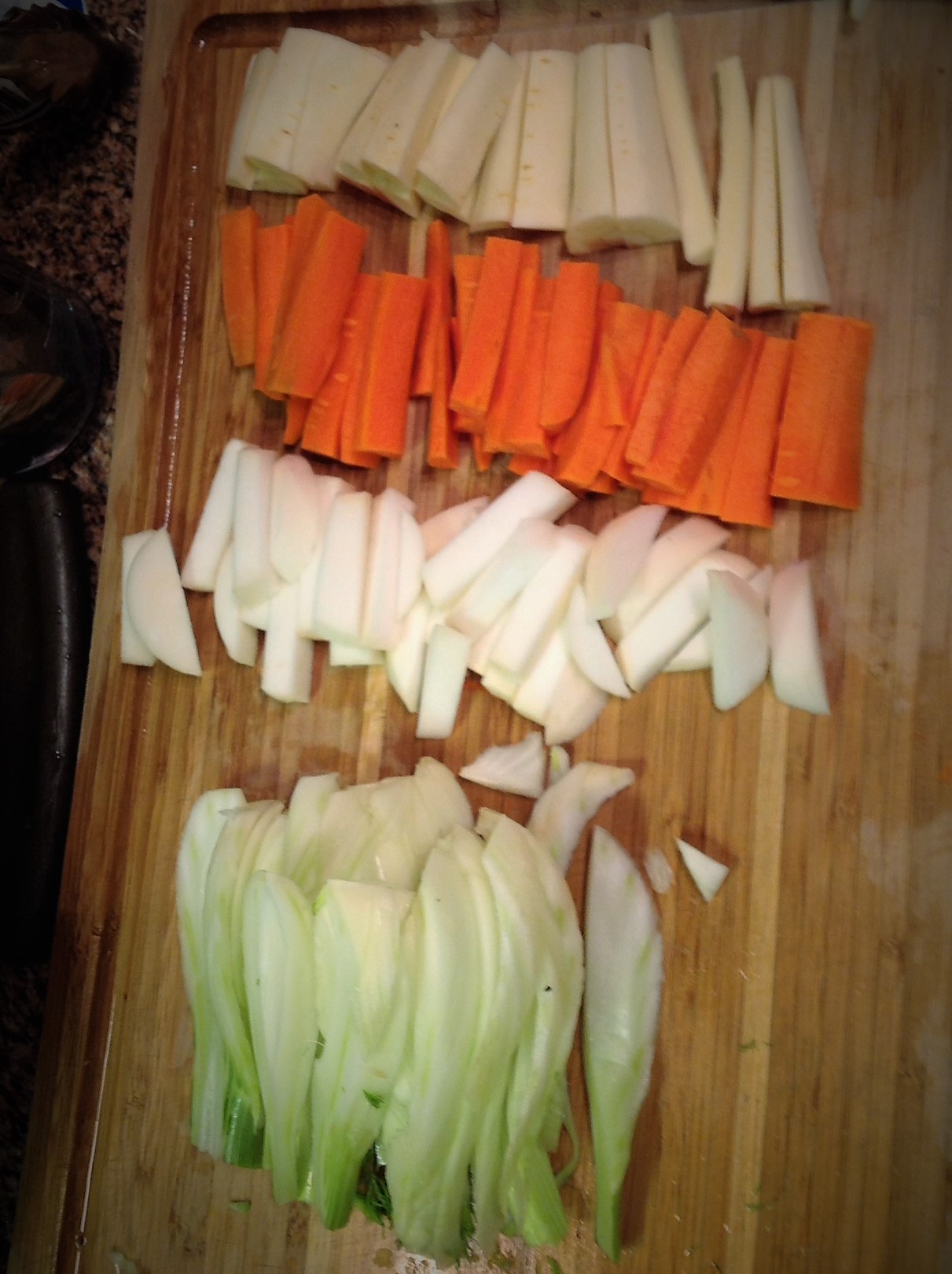 Add the carrot, parsnip, turnip, fennel, and shallot to the pre-heated pan. Let sear until golden around the edges, about 10 minutes.