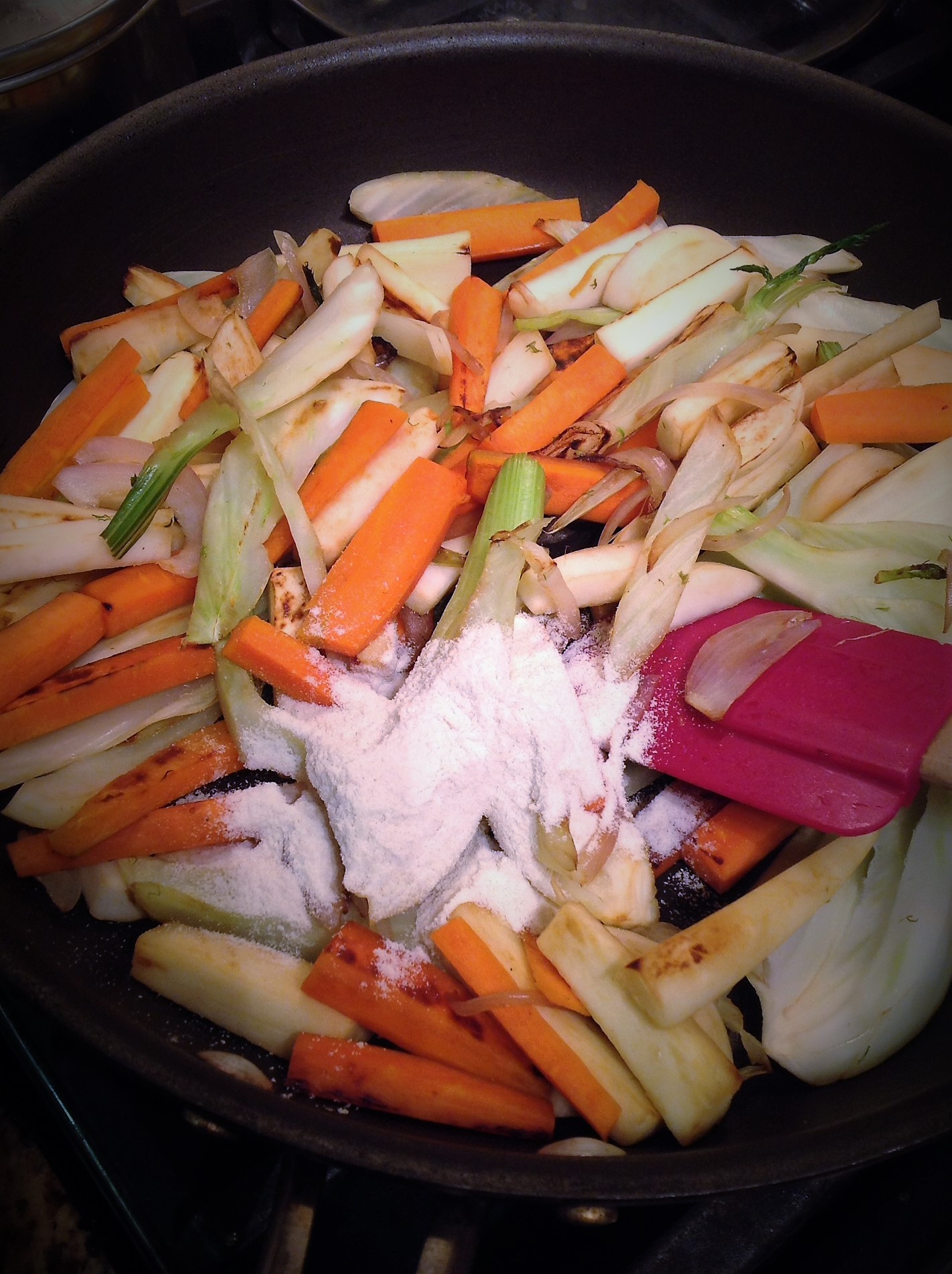 When the vegetables are lightly browned, add the brown rice flour. Stir well to dust the vegetables with the flour. Cook 2-3 minutes, just until the flour is no longer white.
