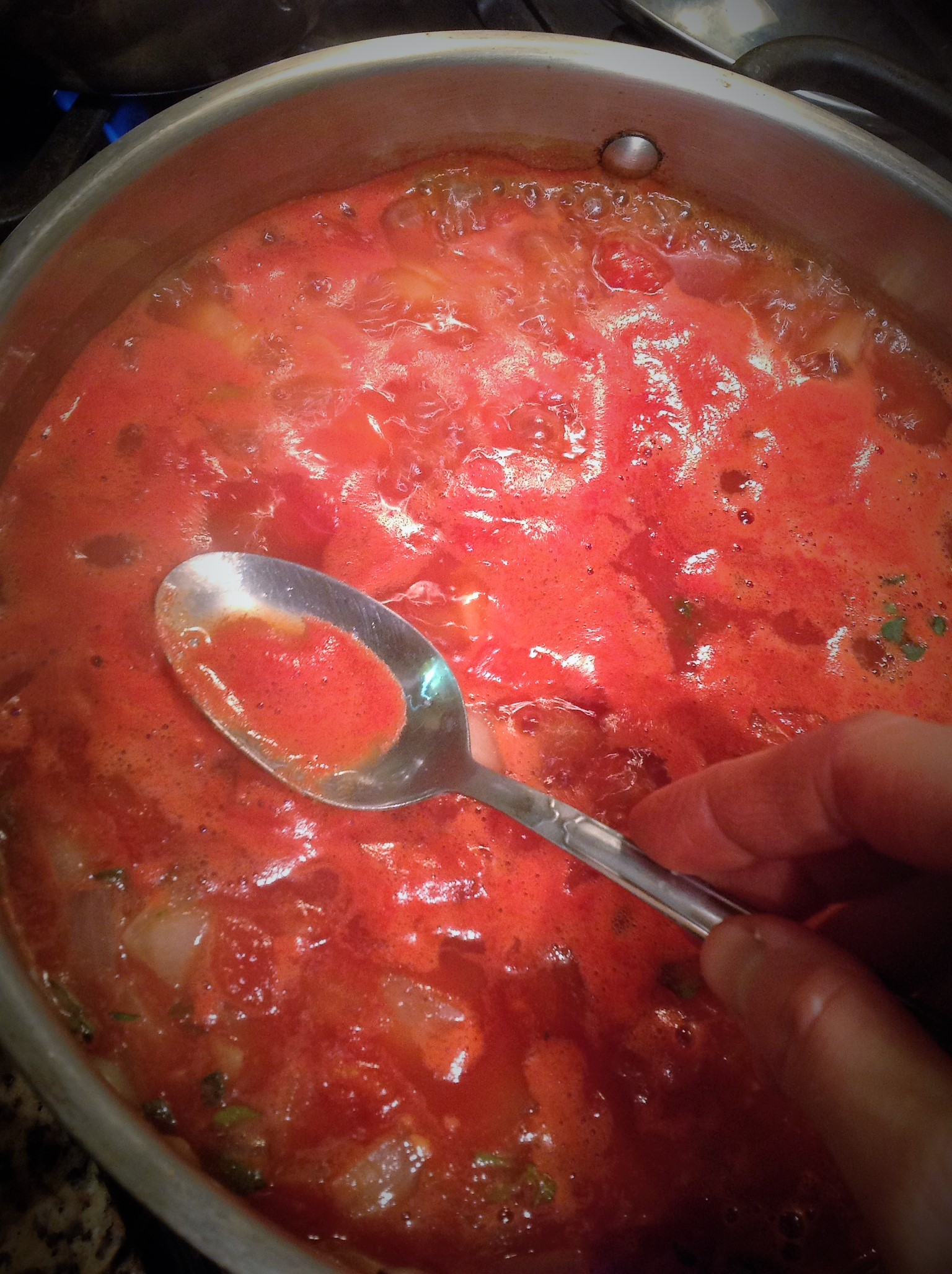 After about 30 minutes, your sauce will thicken and be quite aromatic. It’s ready. In the meantime, preheat your oven to 350F.