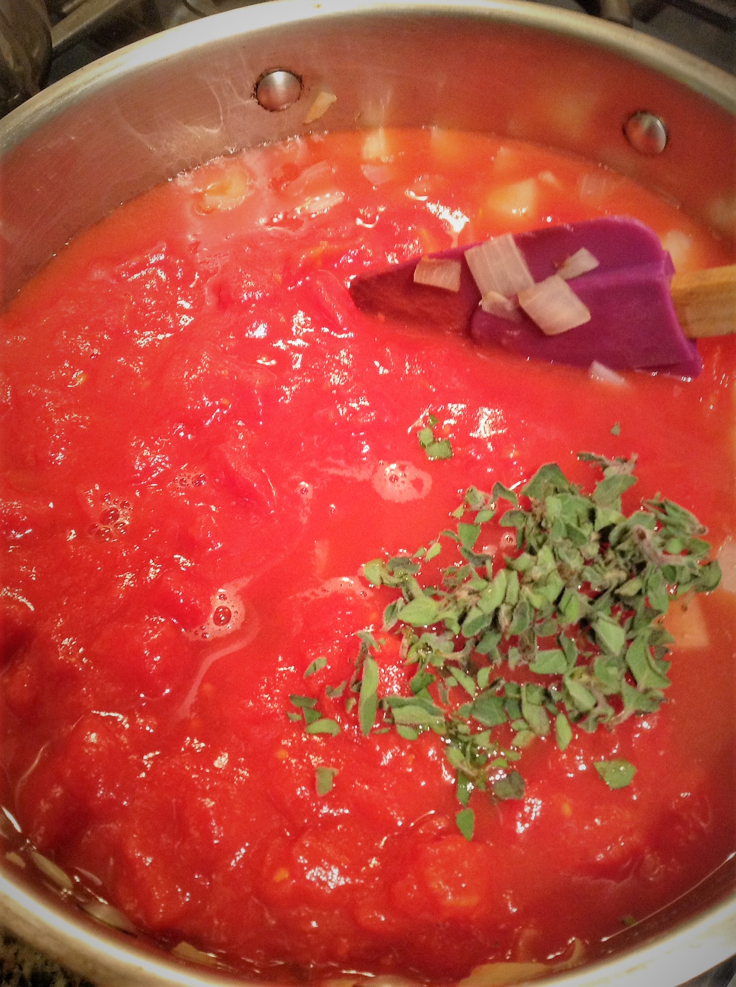To make the Stewed Tomato Sauce: Place the diced onion in a medium pan. Cover and cook over medium-high heat for about 7 minutes, until golden around the edges. When the onions start to turn brown around the edges, add the minced garlic, canned tomatoes, and chopped oregano, along with 3 cups of water. Bring to a boil and then reduce to a simmer. Simmer for 30 minutes, uncovered.