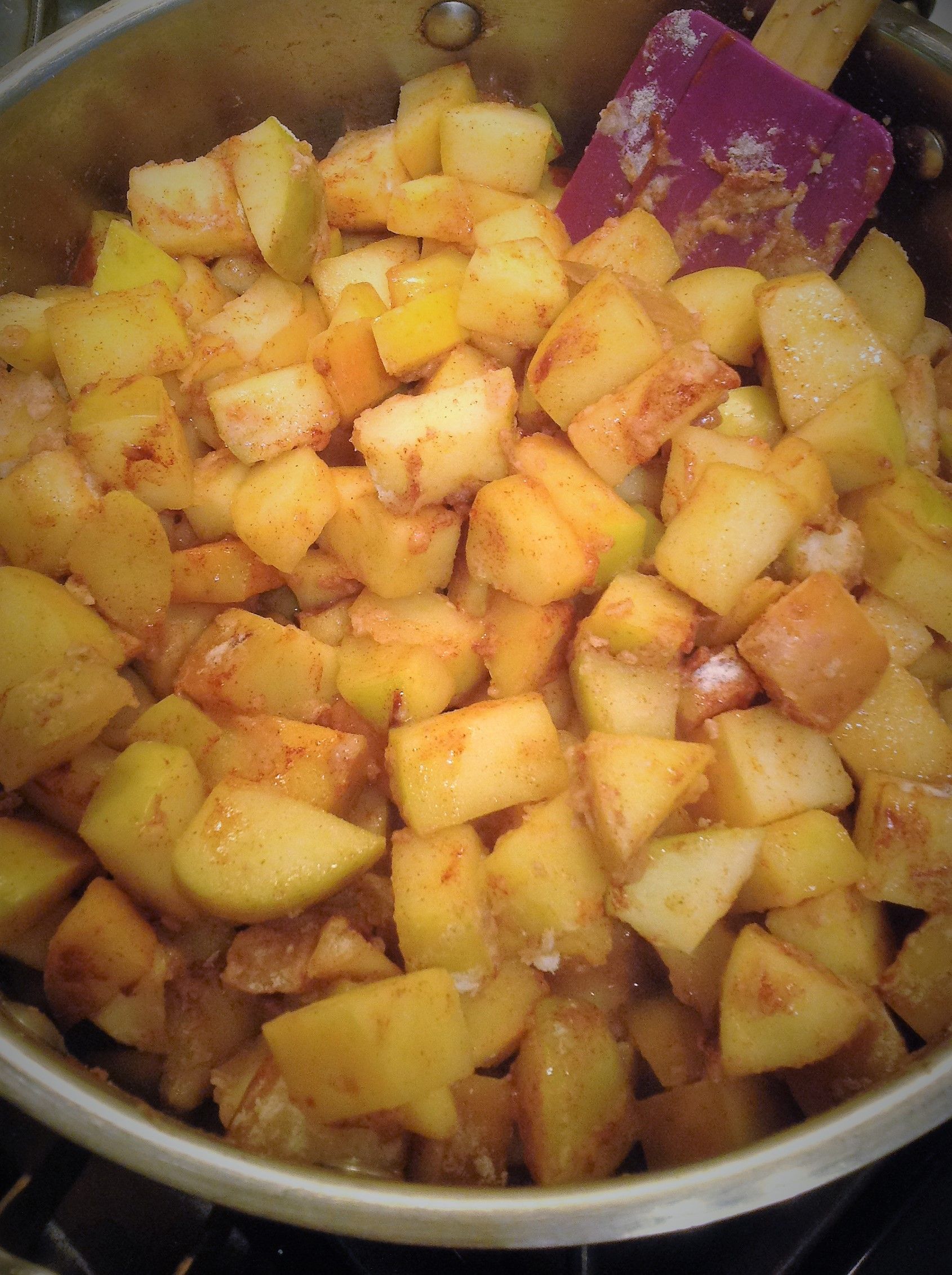 To make the Apple Cinnamon filling: Core and dice the apples into bite-sized pieces. Heat a wide pan over medium heat. Add the apples and cinnamon and cover. When the apples have started to brown and are releasing their juices, add the 2 tablespoons brown rice flour and a 1/2 cup of water. Stir well and cook until water is mostly absorbed, about 5-7 minutes.