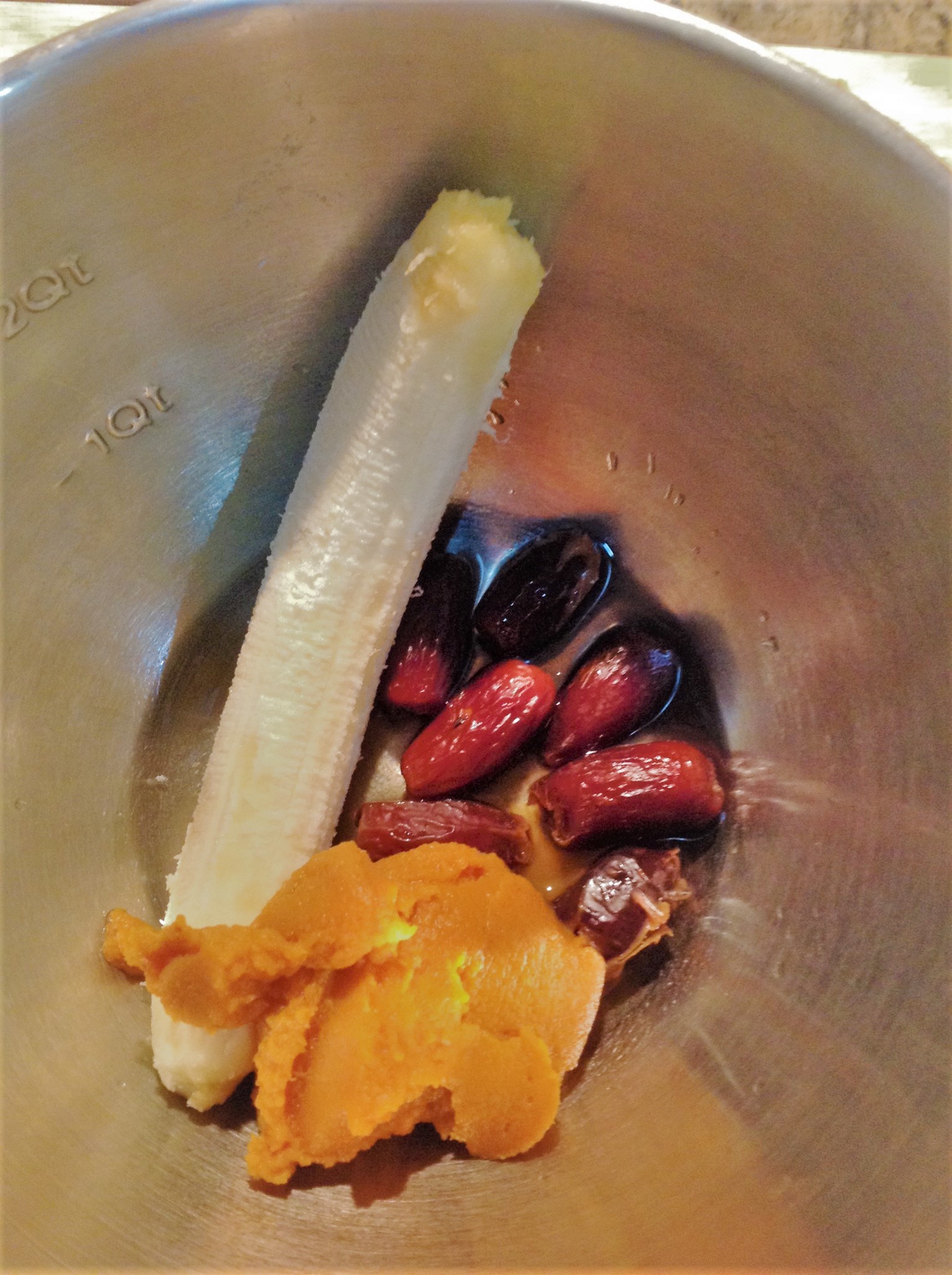 - To make the wet mixture: In a bowl, combine the dates, pumpkin puree, and bananas. Use an immersion blender to puree until smooth. Add the almond butter and puree to combine. You can also use a food processor or a regular blender to puree this wet mixture.