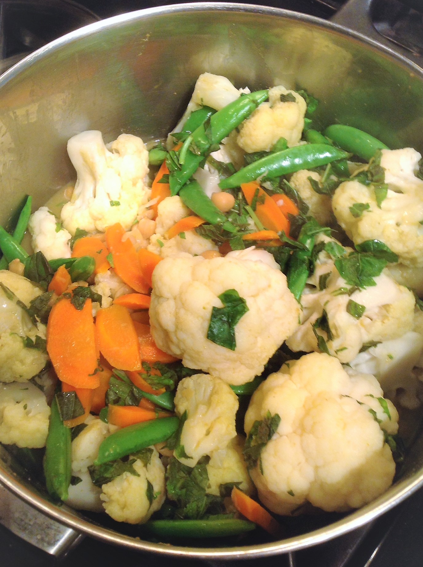 When the veggies are ready, remove the lid and stir in the fresh basil and mint. Taste to adjust seasoning.