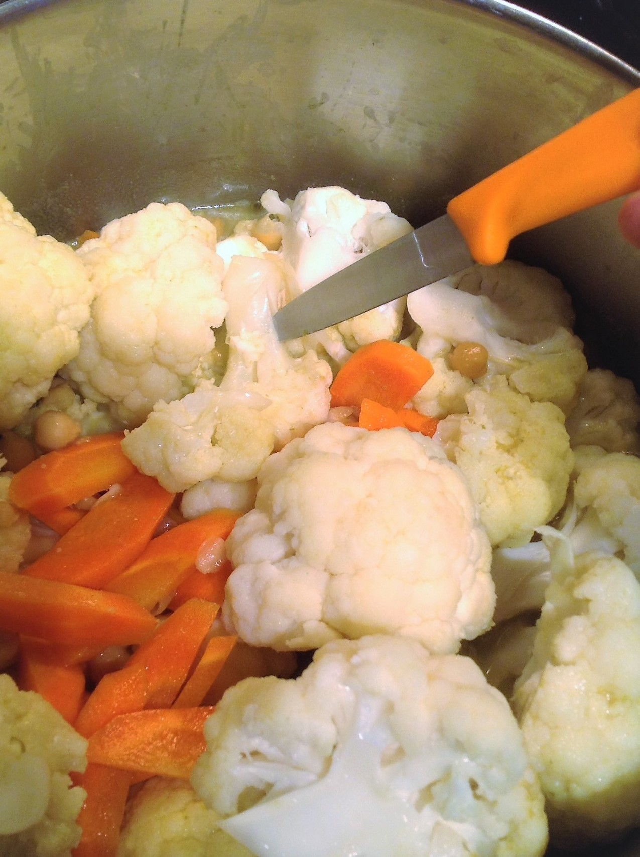 Once the coconut milk mixture is aromatic, add the cauliflower and carrot. Cover and bring the heat up to medium-high. Steam the cauliflower and carrots just until tender. You don’t want to overcook or else the veggies will get mushy.
