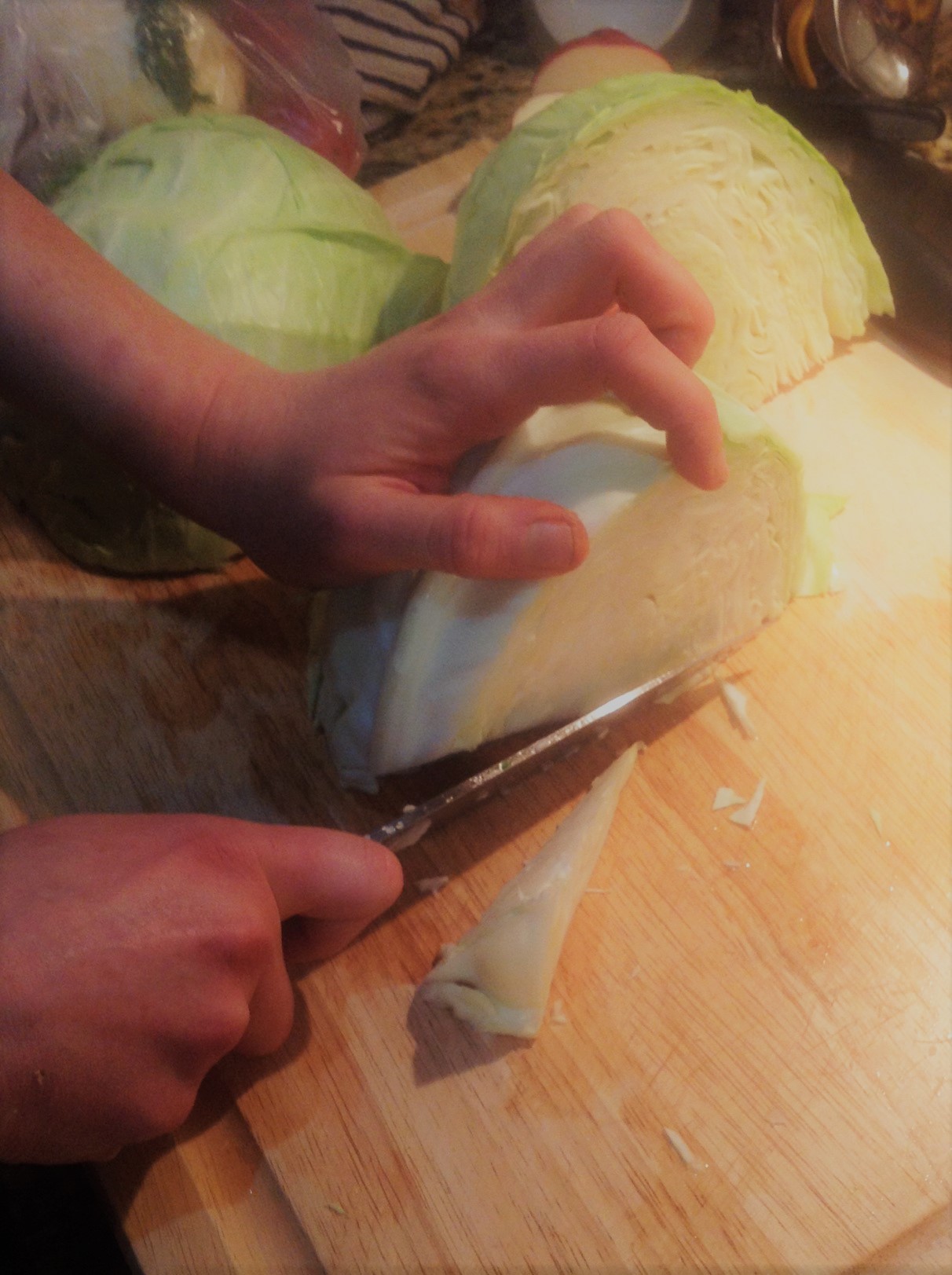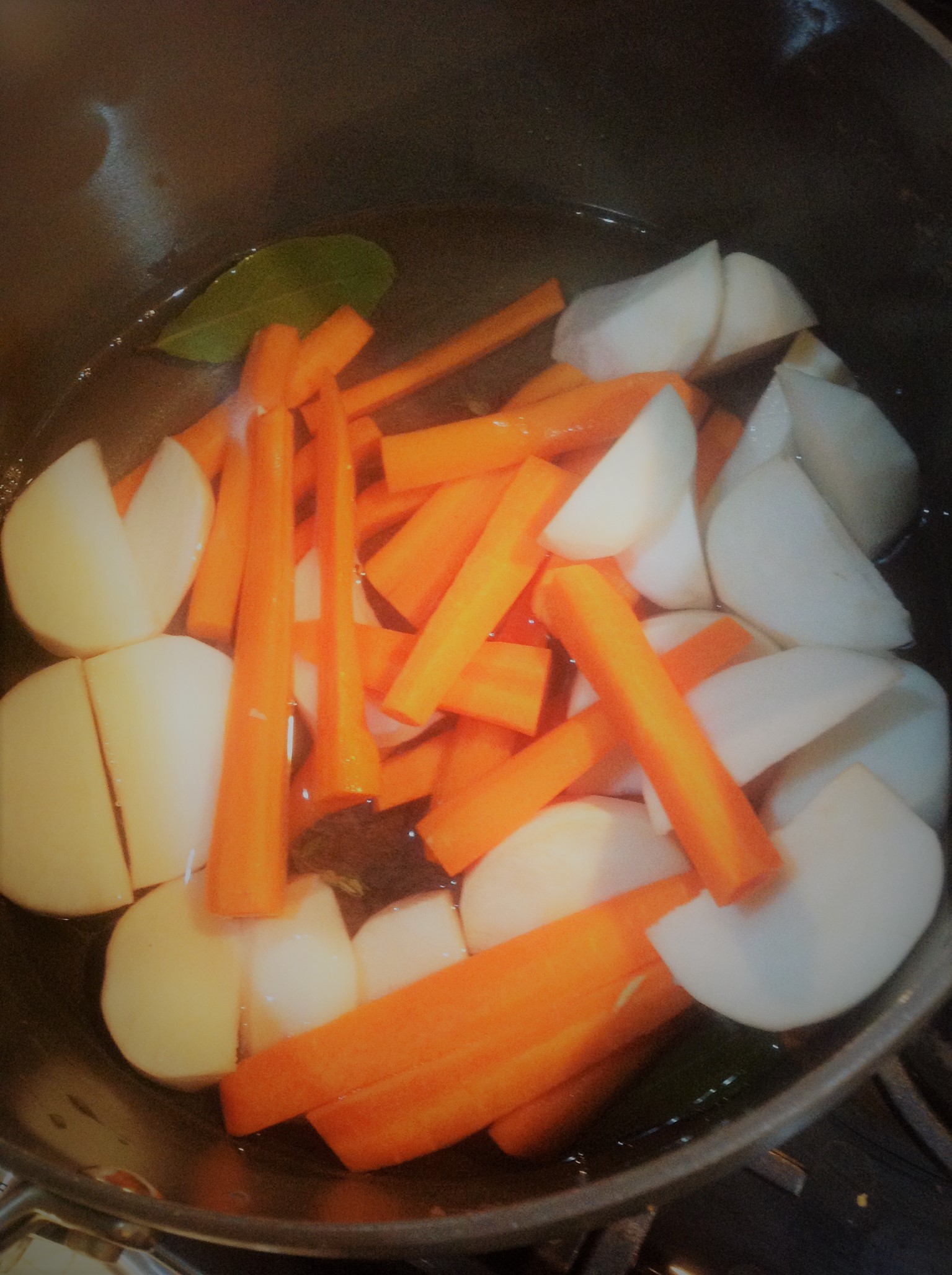 To Prep the Vegetables: Peel off the outer leaves of the cabbage. Keeping the core in, cut in half, then quarters, then cut into large wedges. Peel and trim the turnips and carrots. Cut into large baton-like pieces, a couple inches long. Scrub the potatoes and cut into large wedges, about the same thickness as the carrot and turnip.