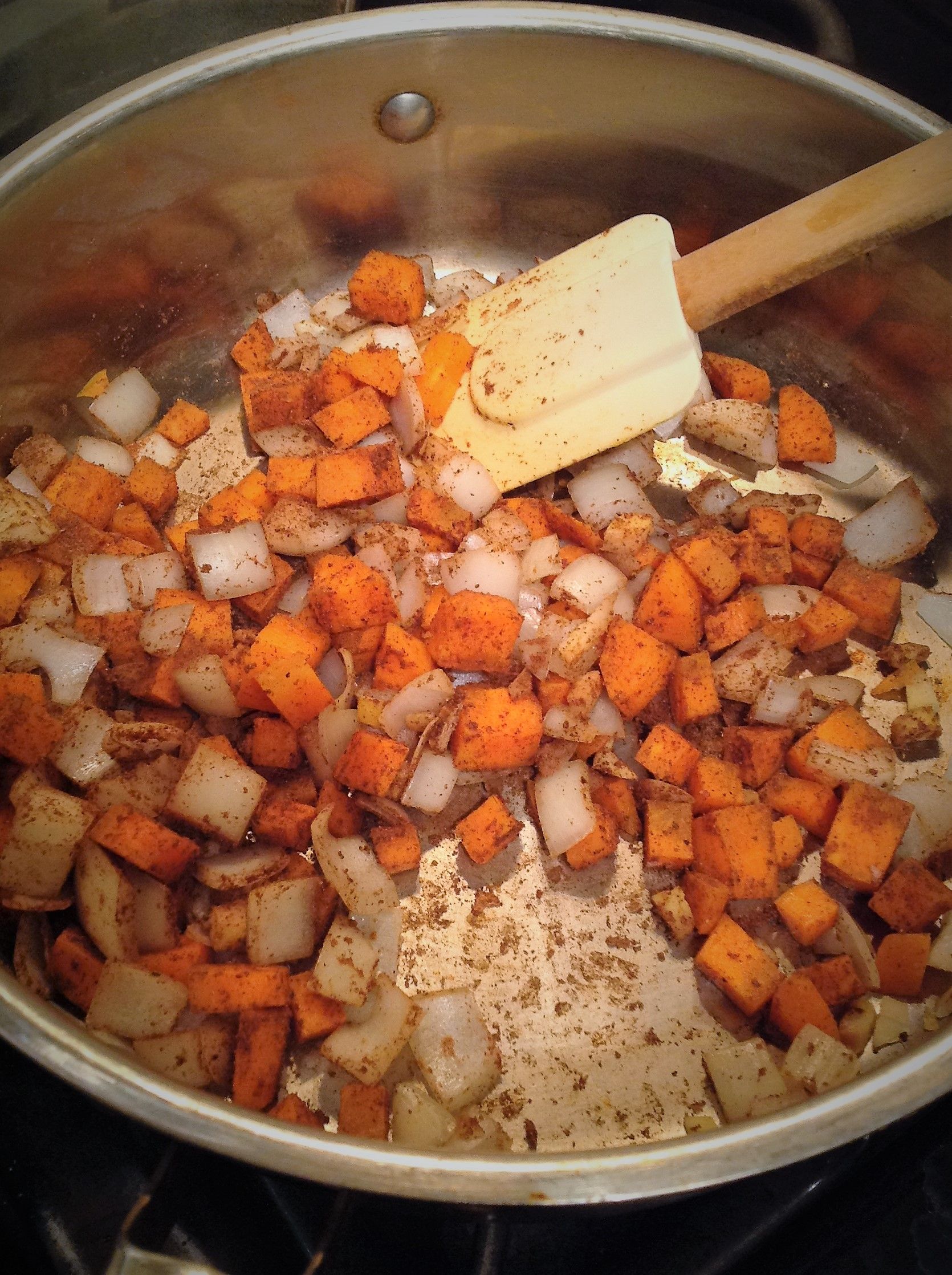 First, sauté the aromatics: Peel and dice the onion and carrot. Peel and mince the ginger. Combine the onion, carrot, and ginger in a medium pot. Add the Garam Masala. Cook over medium heat, covered, until onions soften and Garam becomes aromatic, about 10 minutes.