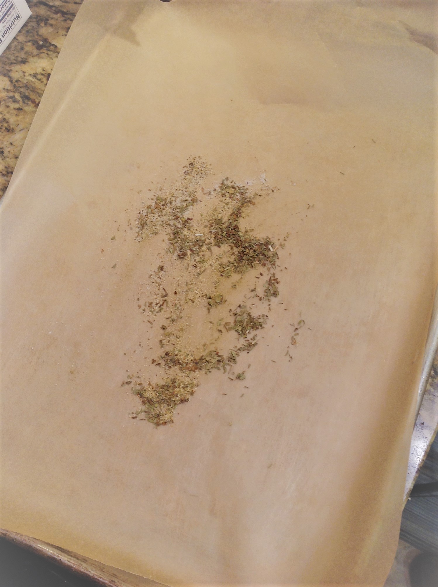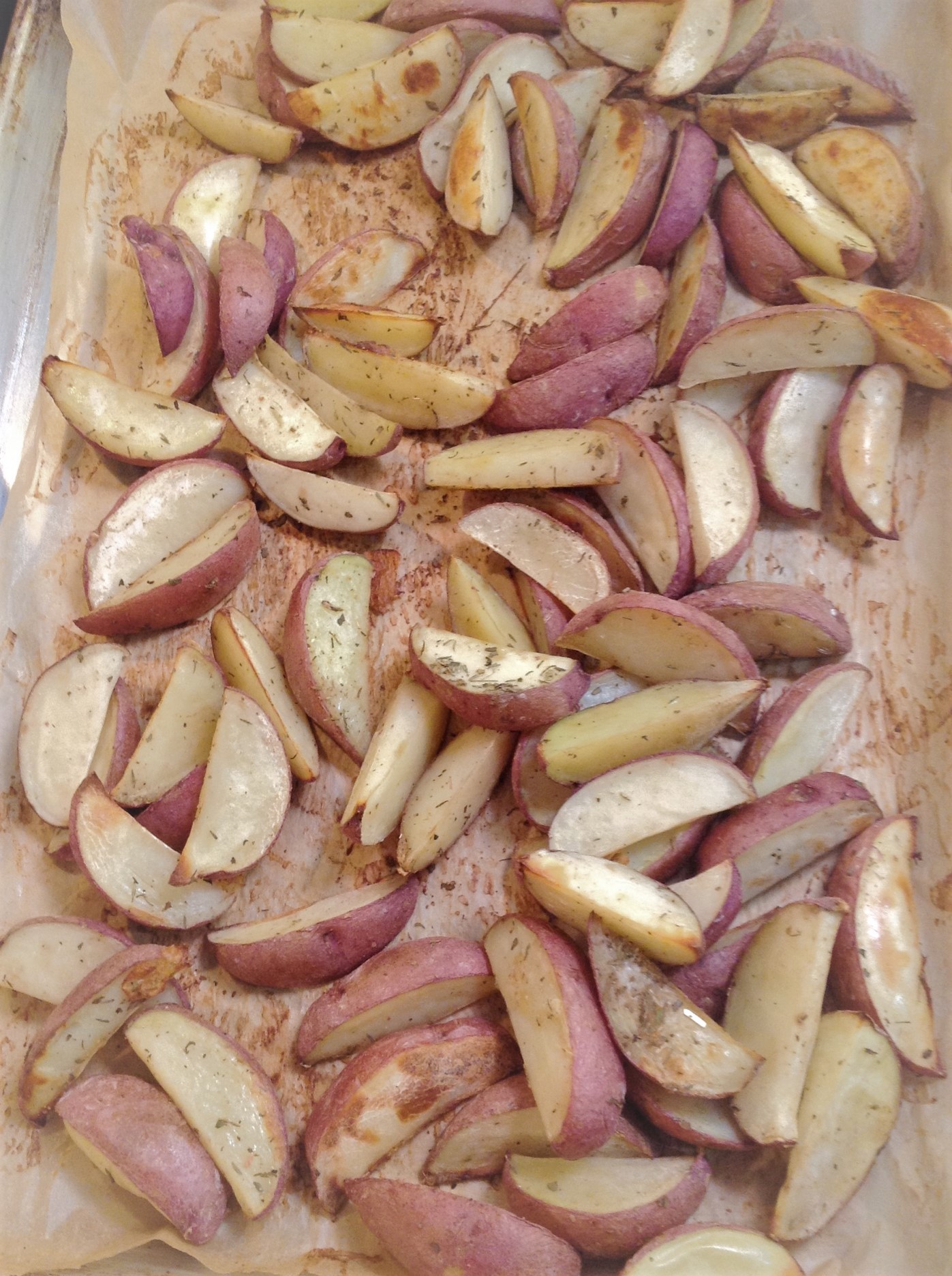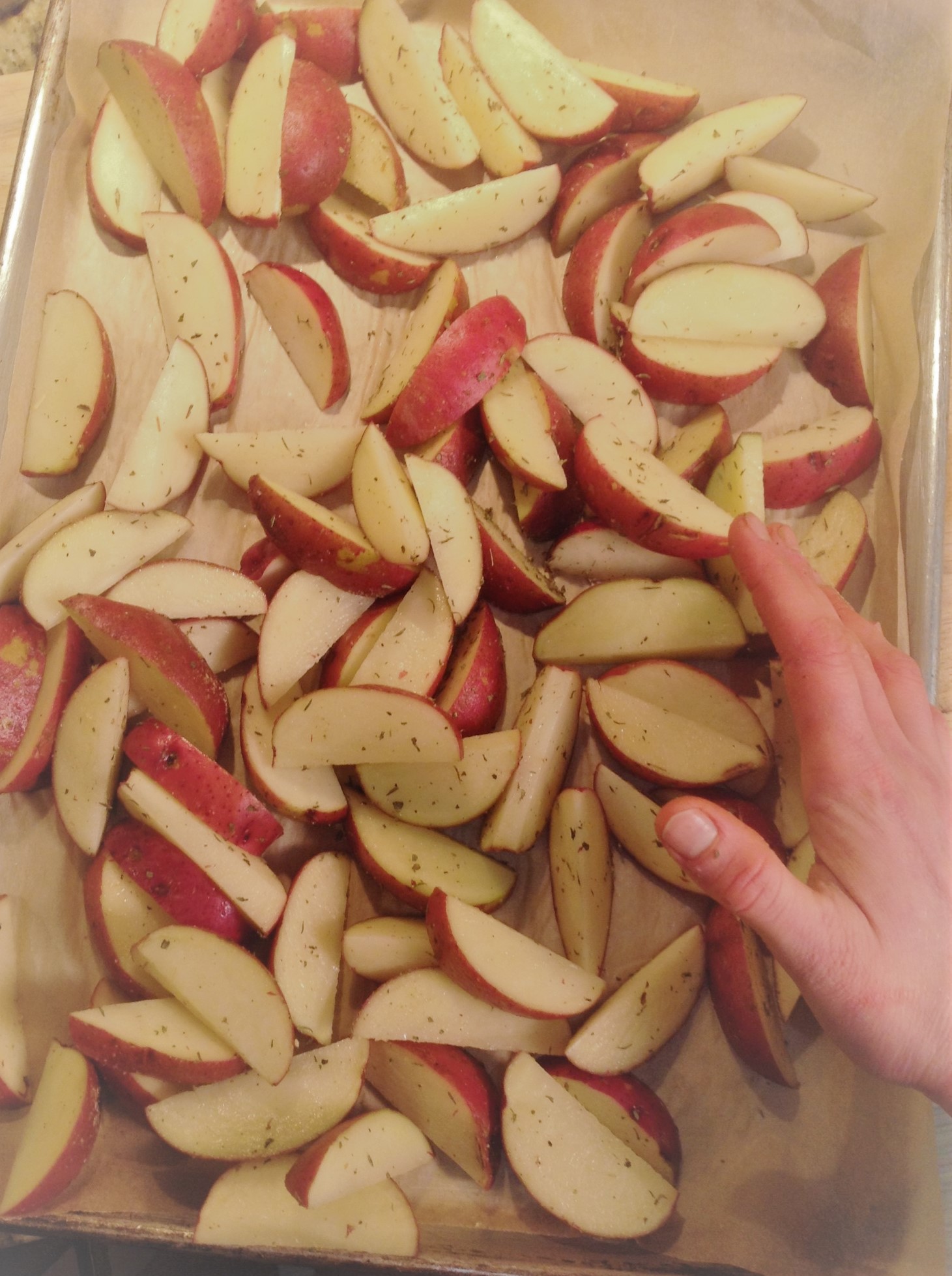 Spread the Italian herb mix on the parchment-lined pan. Spread the red potato wedges into a single layer on top. Season with salt and pepper.