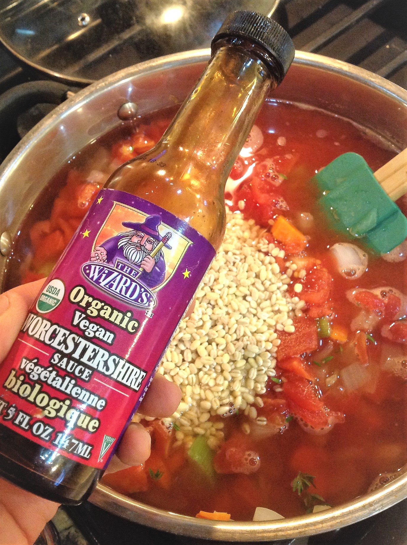 When the onions are translucent, add the canned tomatoes, barley, garlic, bay leaf, black pepper, Worcestershire sauce, vegan bullion, and water.