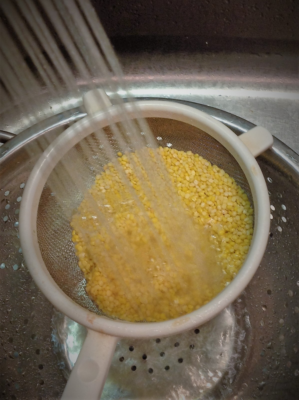 To prepare the Khichdi (Curried Indian Mung Beans and Rice): Rinse the mung beans under running water for about 30 seconds, until there is no foam coming from the beans. Set aside.