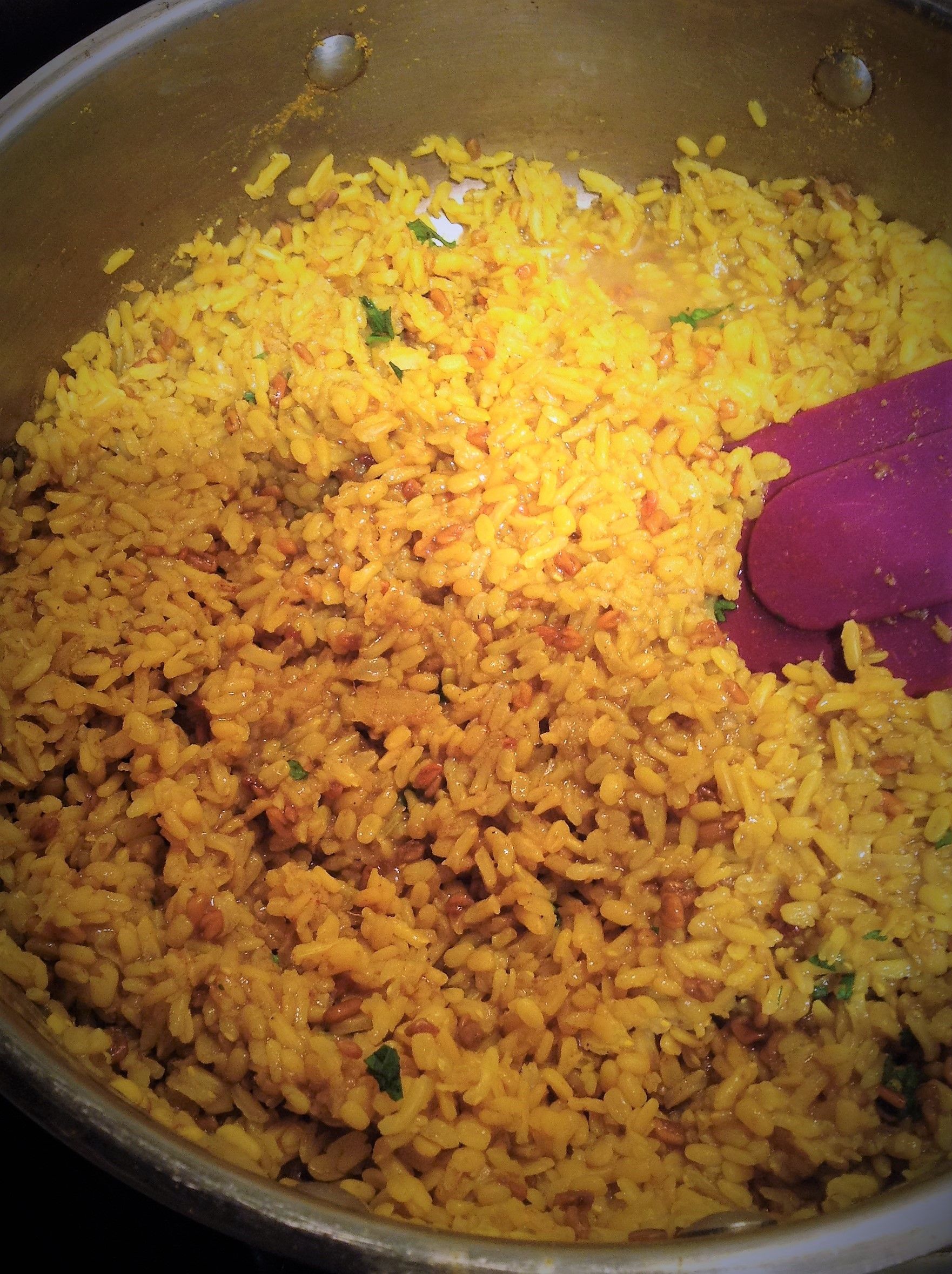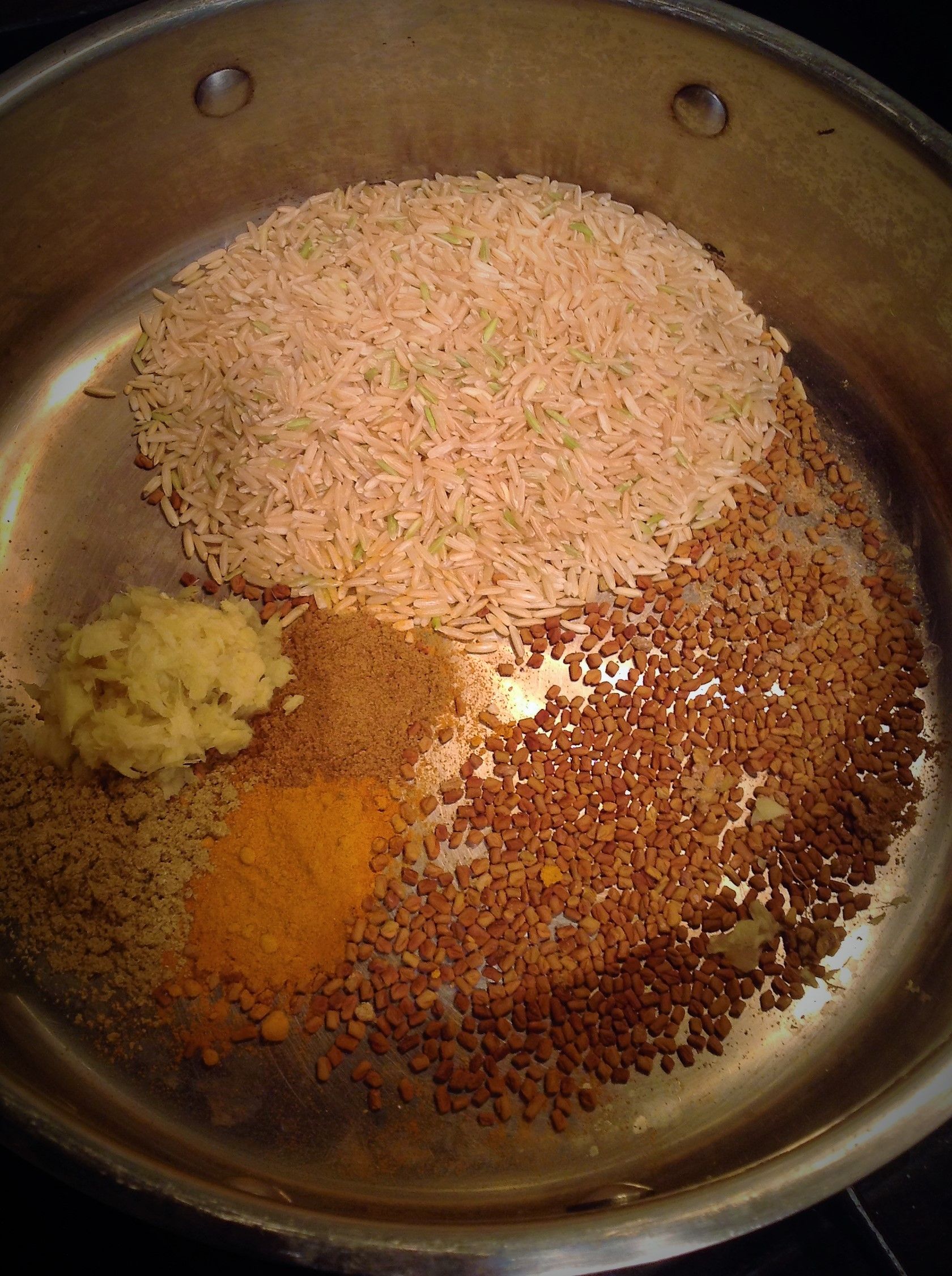 Place the fenugreek seeds in a medium pot. Turn the heat to medium, cover, and toast 2-3 minutes, until slightly darker and aromatic. Add the rice, the remaining spices, and the fresh ginger. Cover and toast another 2-3 minutes, just until aromatic. When the rice begins to “pop” and darken, you’re done toasting.