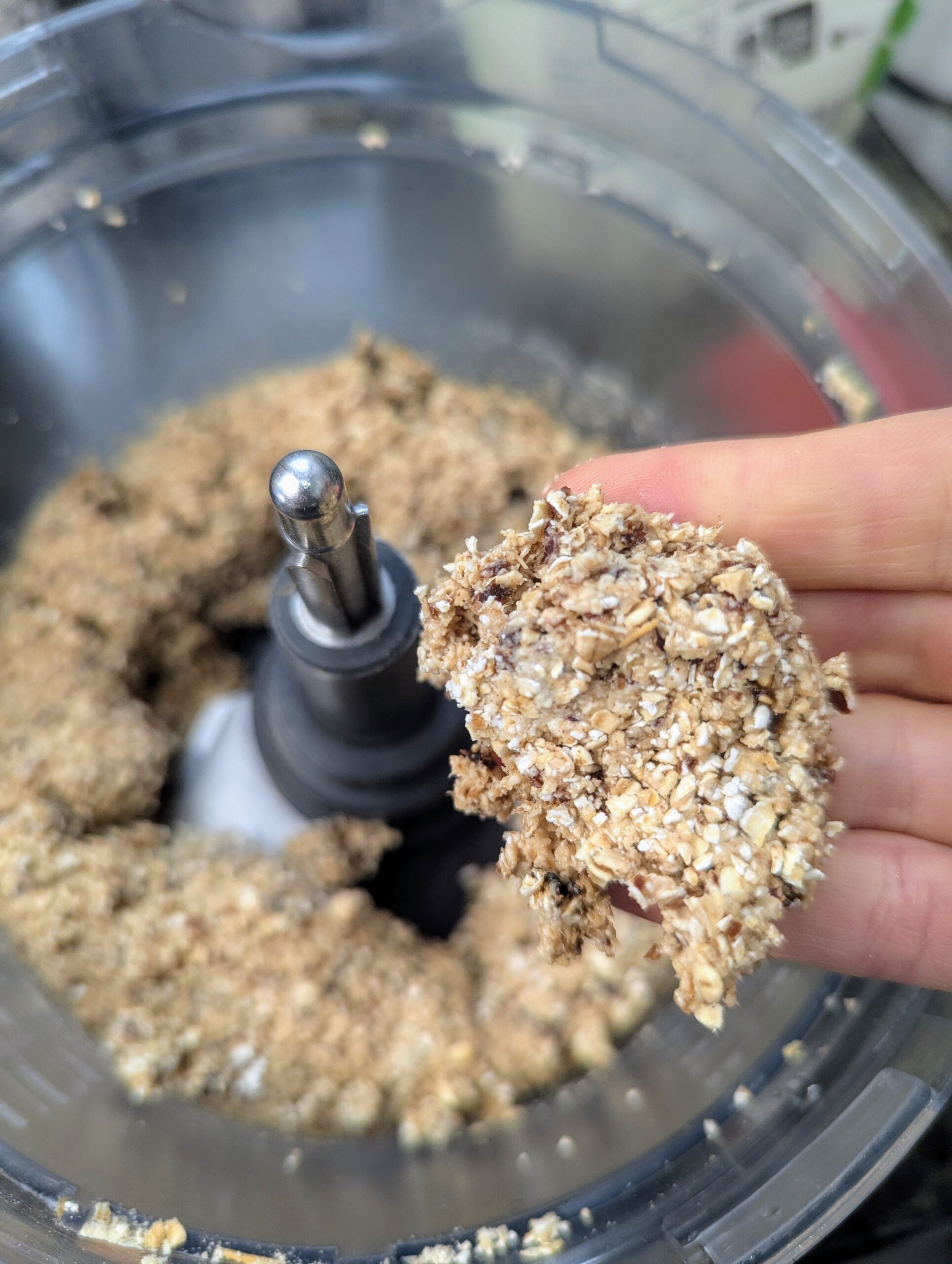 - To check the mix, remove the lid of the food processor and grab a small ball of the bar mixture. It should clump easily but not stick to your hands. If it’s not clumping, drizzle in a bit more water. If it’s too sticky, add an extra scoop of oats.