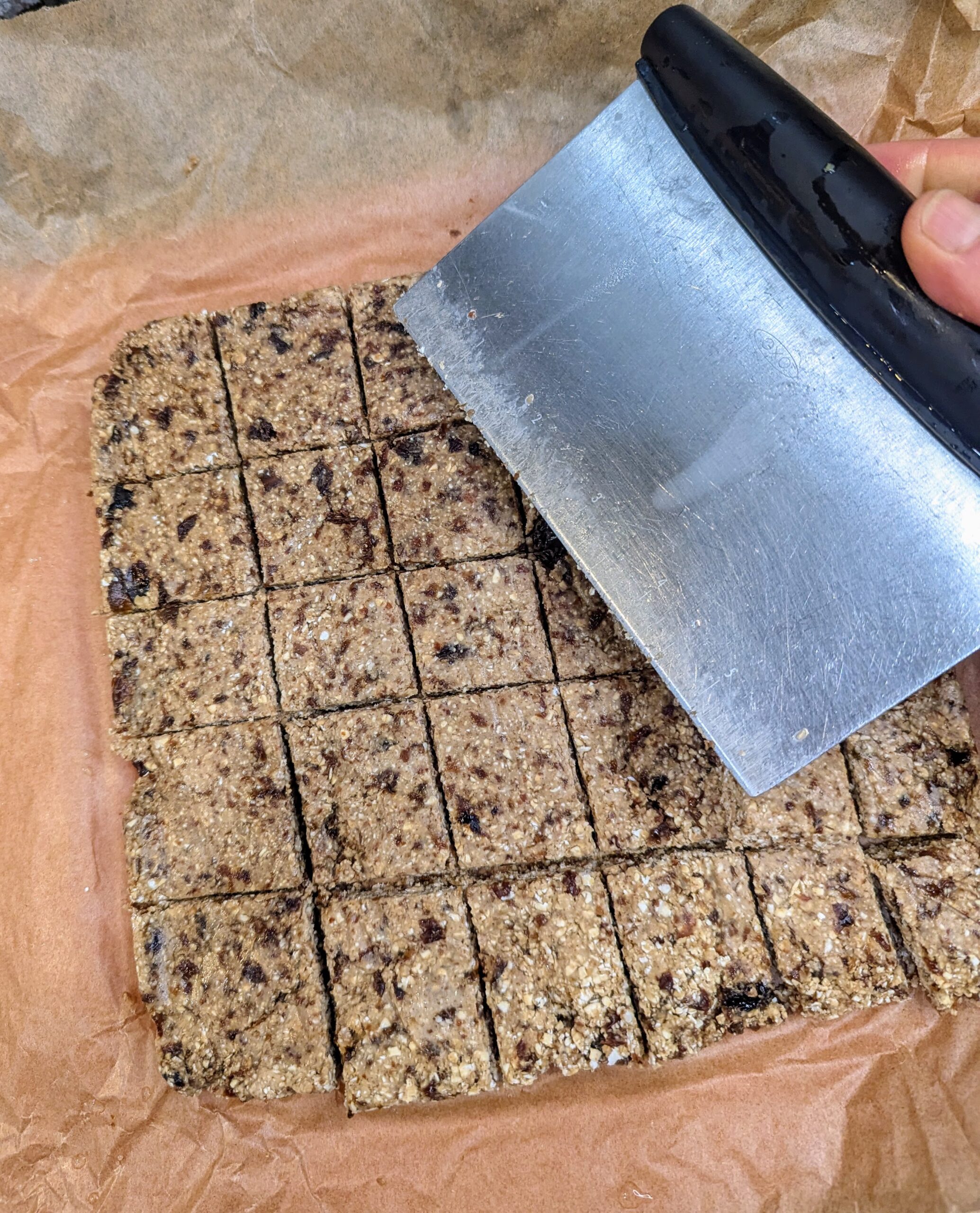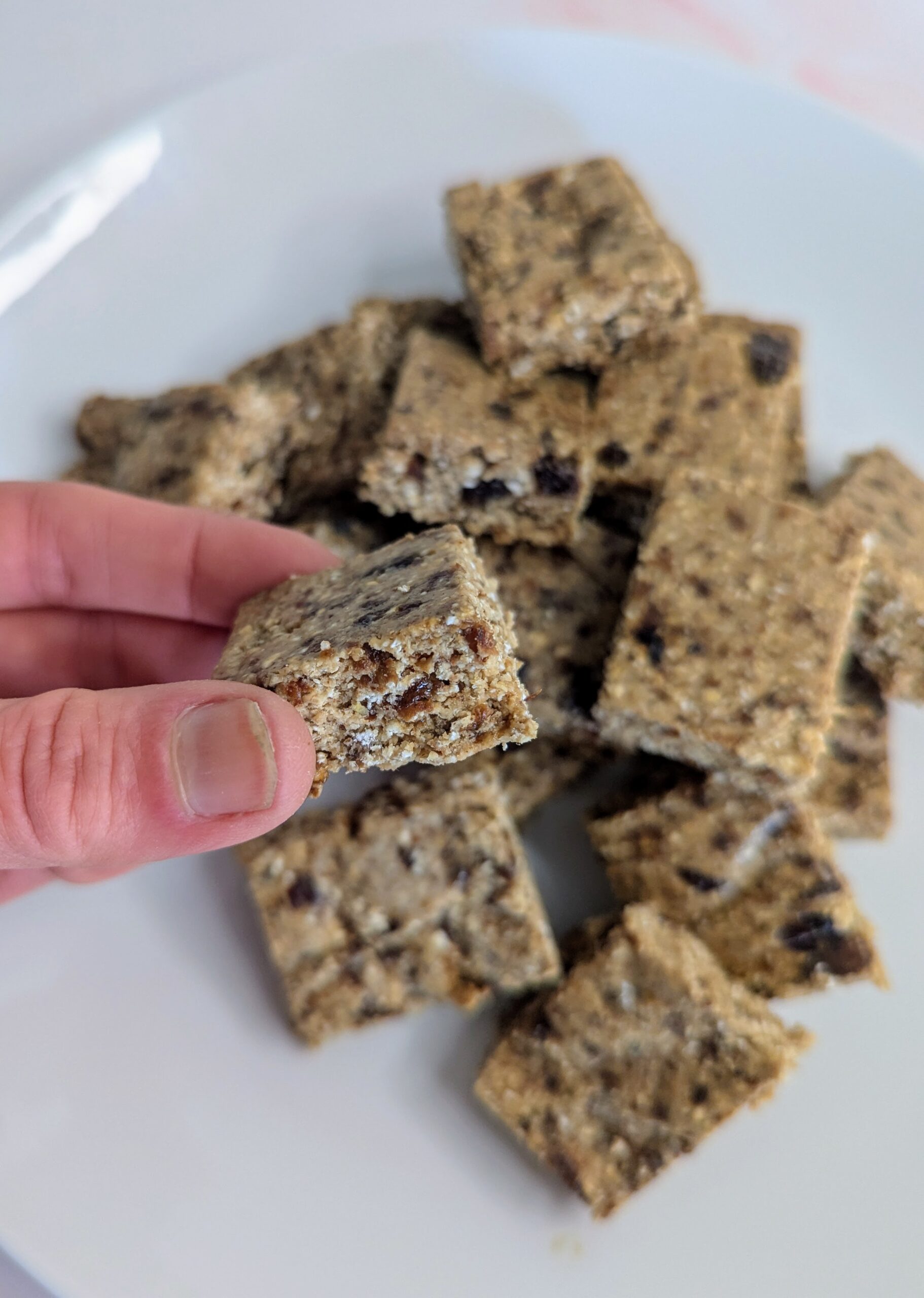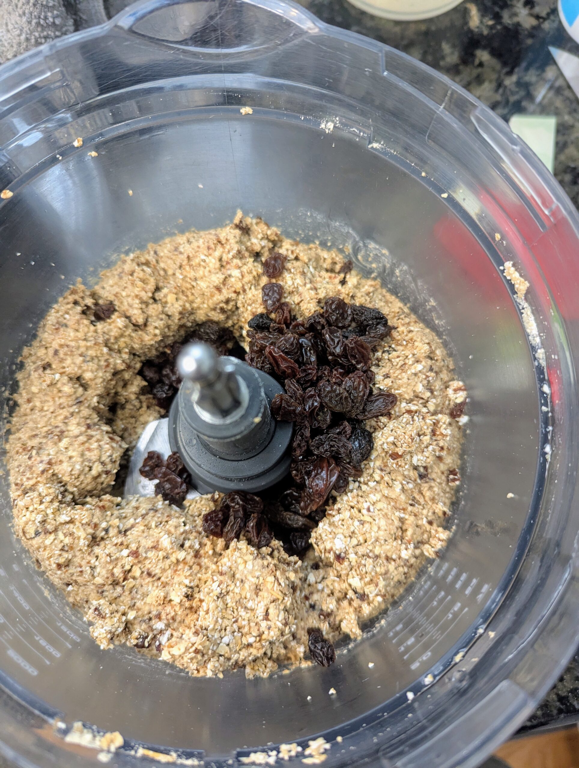 - Once you have the right consistency on your bars, add in the last 1/2 cup (80g) of raisins. Pulse 5-7 times, just to combine the raisins into the mix.