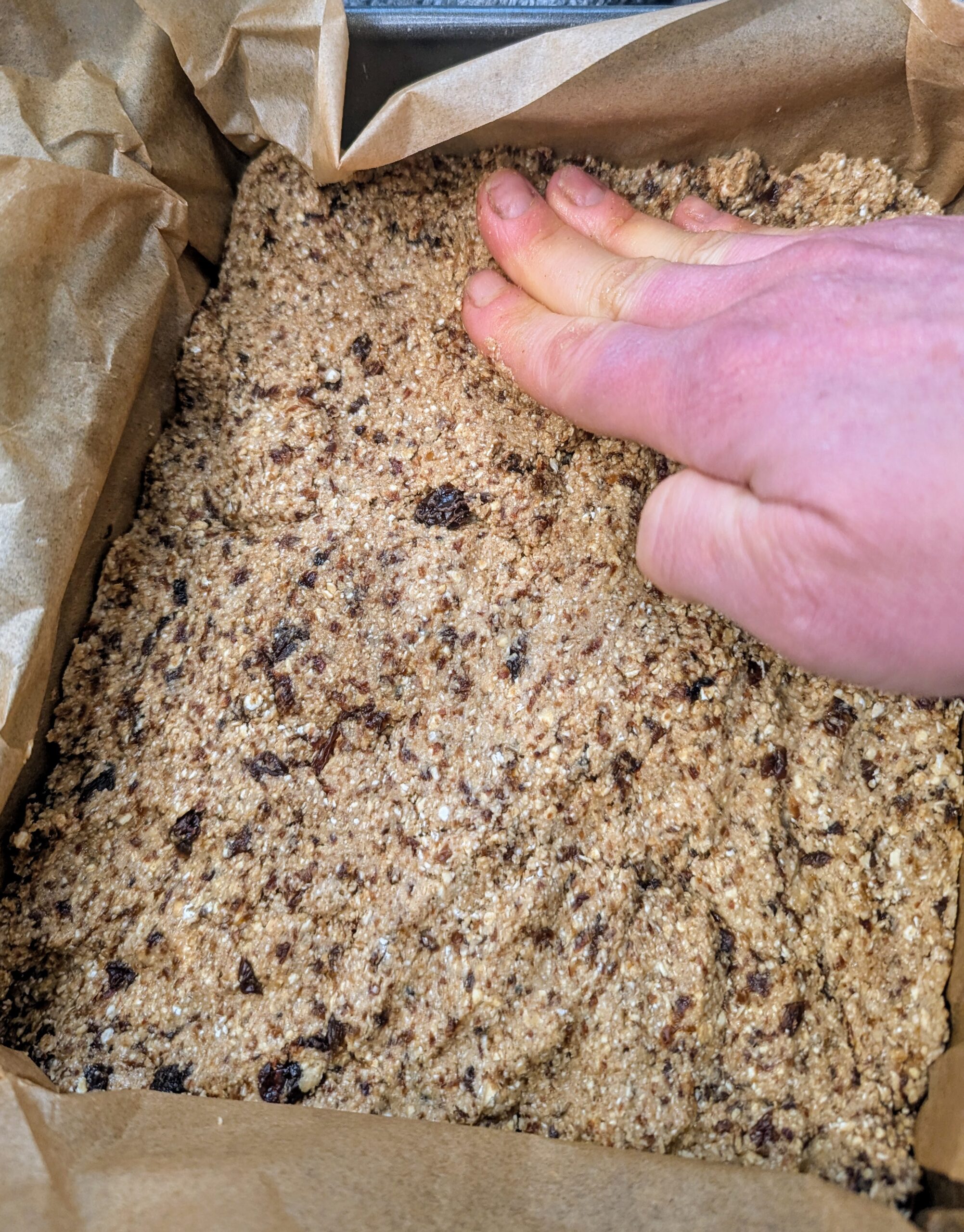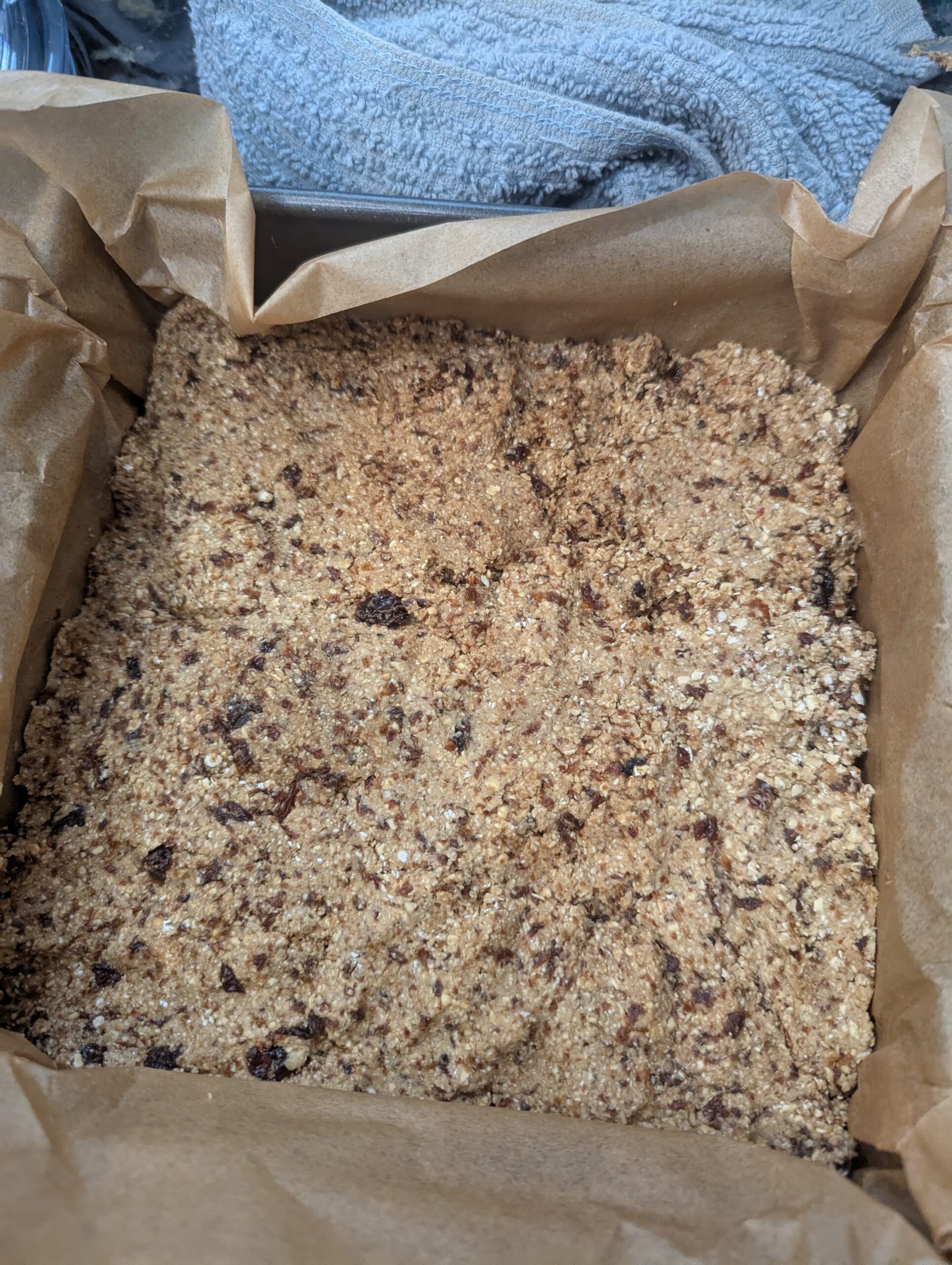 - To make the Cinnamon Raisin Protein Bars: Line an 8×8 pan with parchment paper or plastic wrap.