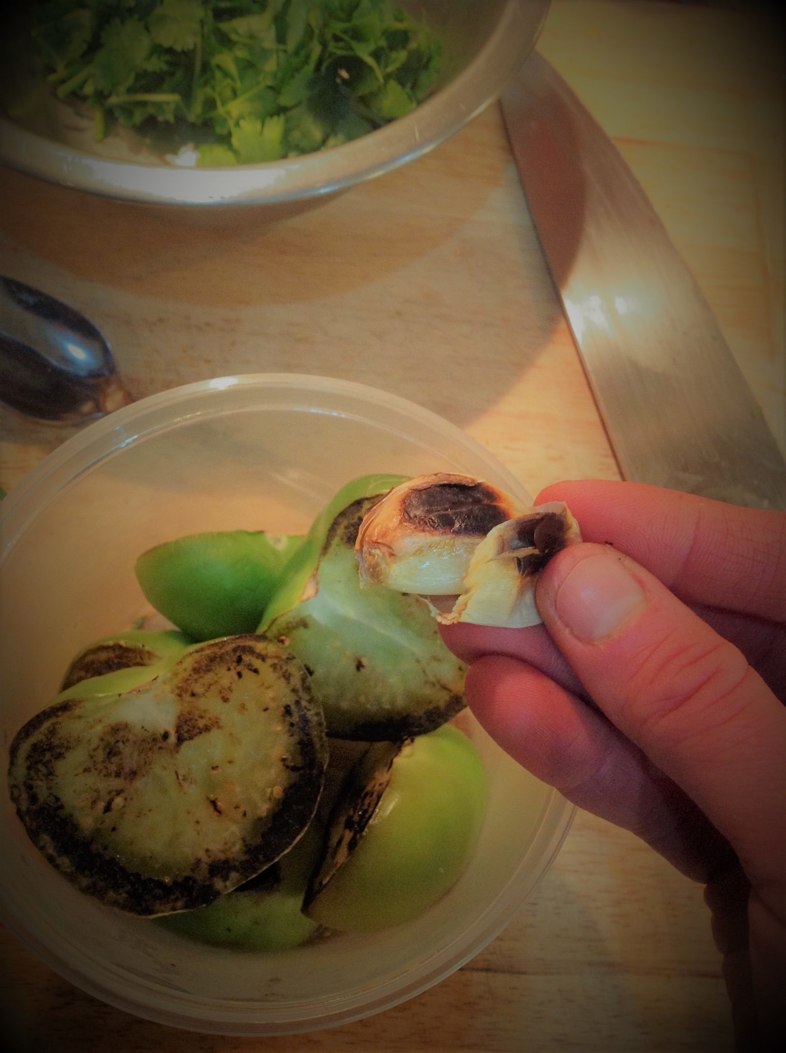 To make the Tomatillo Serrano Guacamole: Preheat a small non-stick pan over medium-high heat. If possible, use cast iron or even a griddle. Husk, rinse, and halve the tomatillos. Halve the serrano pepper. Lay the tomatillos in cut-side down. Lay in the unpeeled garlic and serrano pepper. Cook until lightly charred, about 3-4 minutes. Flip and char the second side, another 2-3 minutes. Remove the garlic from the peel. Place the tomatillos, garlic, and serrano in a blender. Set aside for a few minutes to let cool. This is a good time to prepare the tostadas and bulgur. Once the tomatillos have cooled, add the cilantro, avocado, salt, and ¼ cup of water. Puree. You may need more water (up to ¼ cup) to get a thick, yet smooth, consistency. Set aside until ready to assemble.