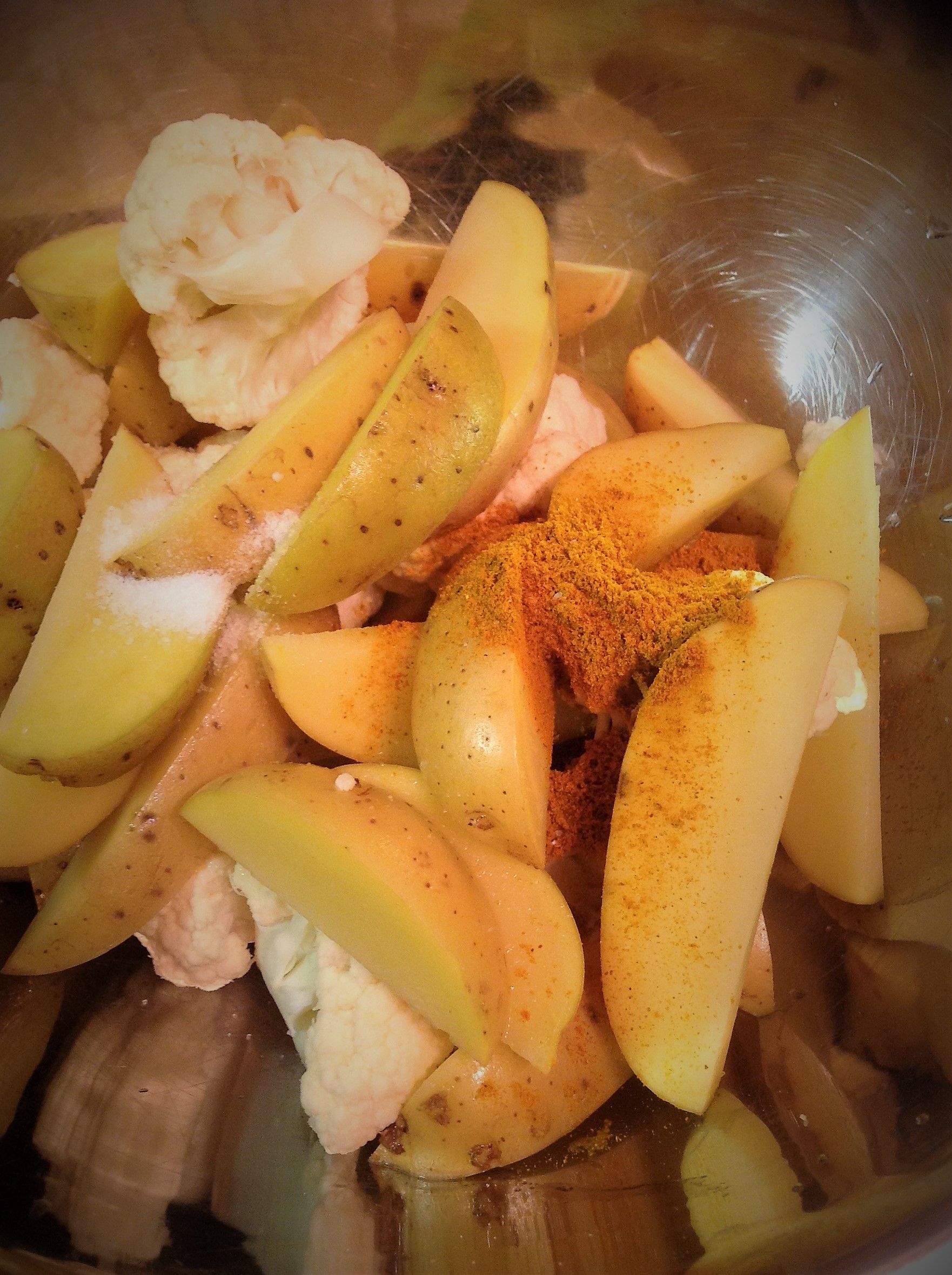 To make the Oil-Free Curry Roasted Cauliflower and Yukon Gold Potatoes: Combine potatoes and cauliflower with the curry powder and salt. Toss well until evenly coated.