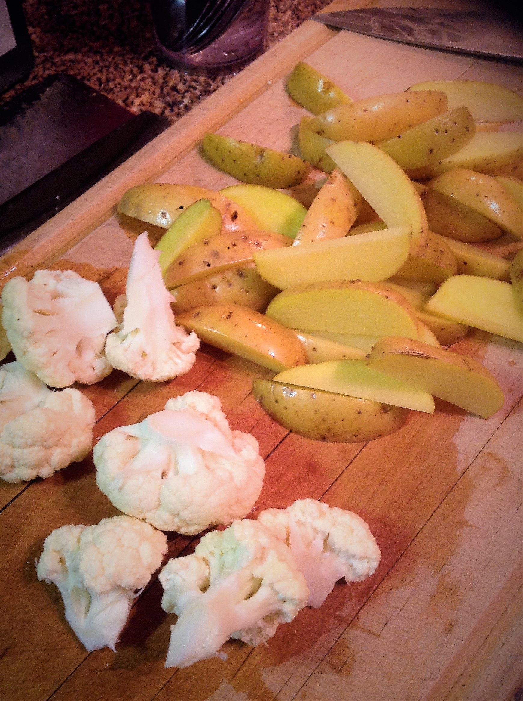 Spread the potatoes and cauliflower into a single layer on the baking sheet. Roast at 425 for 20-25 minutes, stir every 8-10 minutes.