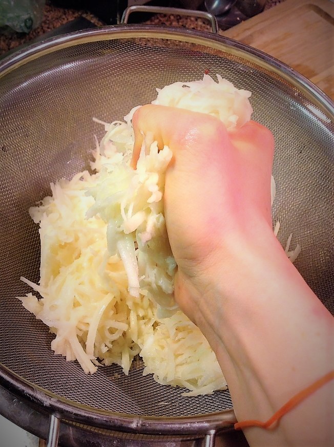 Transfer the shredded onion and potato to a clean kitchen towel, set up over a colander. Squeeze the onion potato mixture to get out as much of the moisture as you can. Discard these juices.