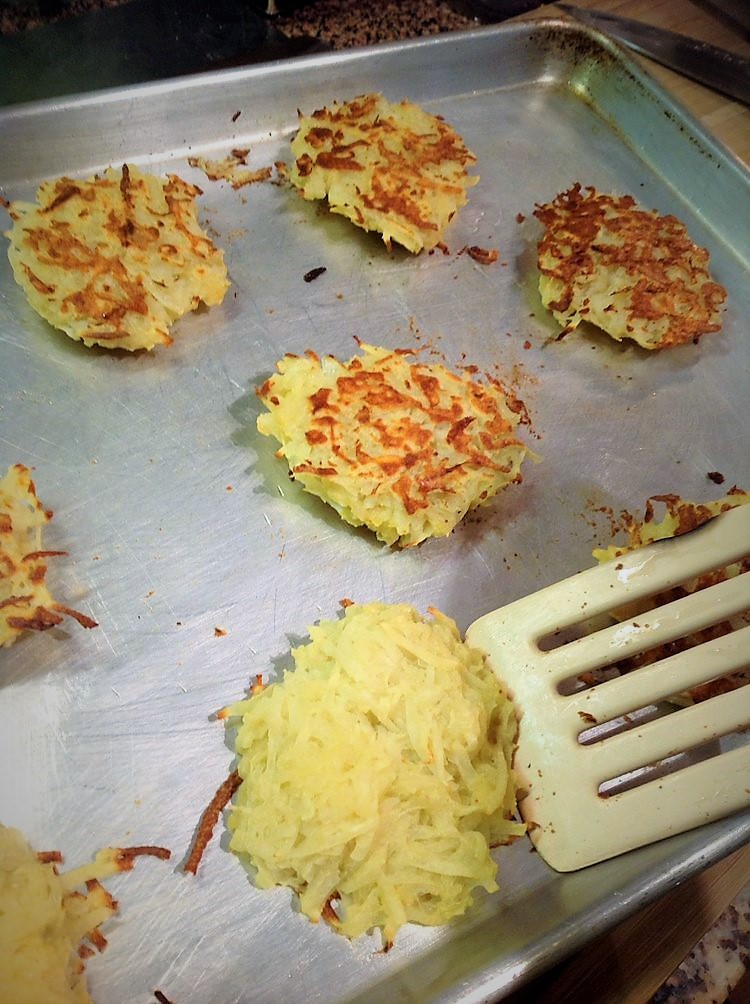 Portion about 1/4 cup of the potato onion mixture for each latke. Flatten with your hands. This should make about 15-16 latkes.
