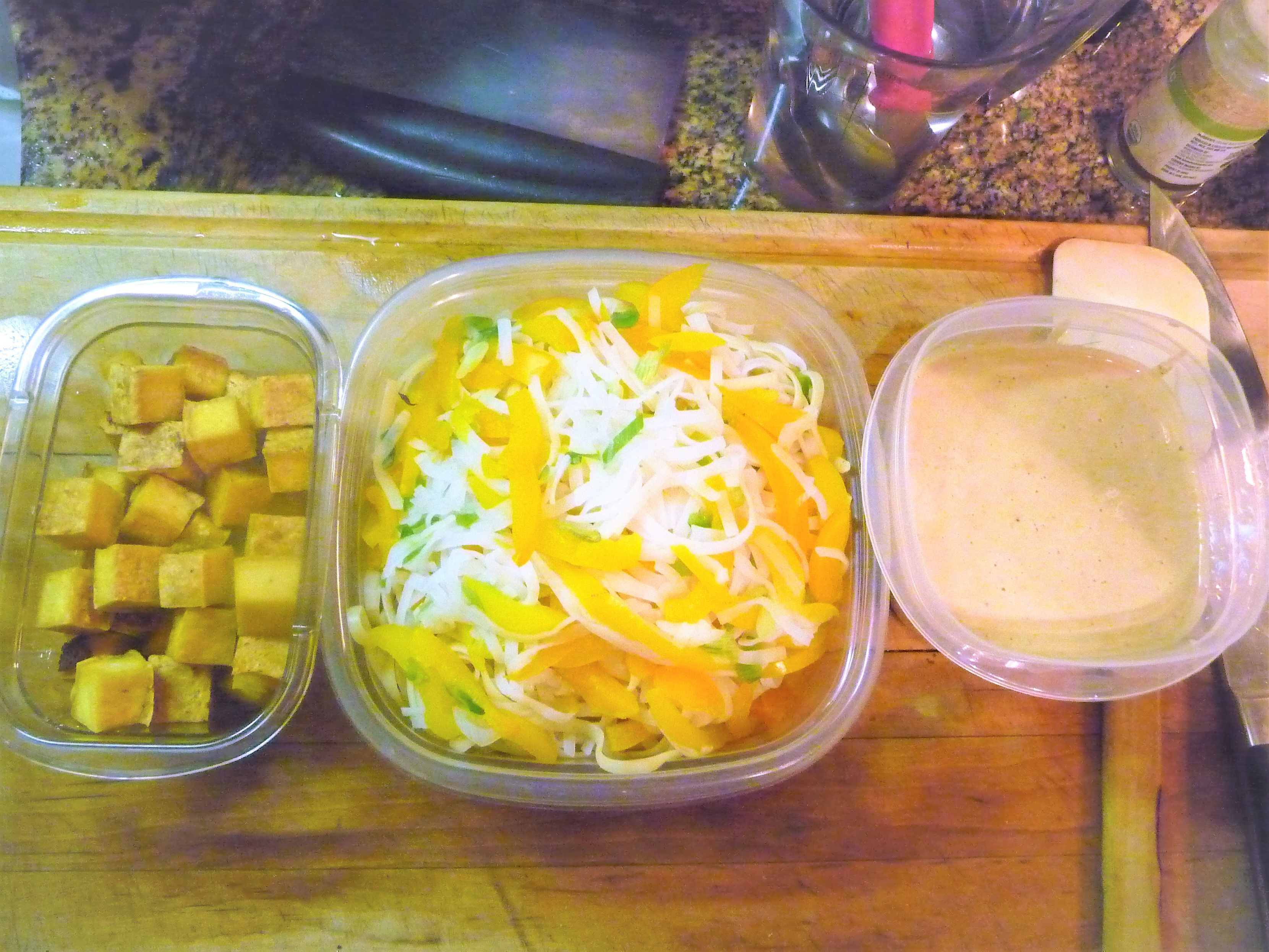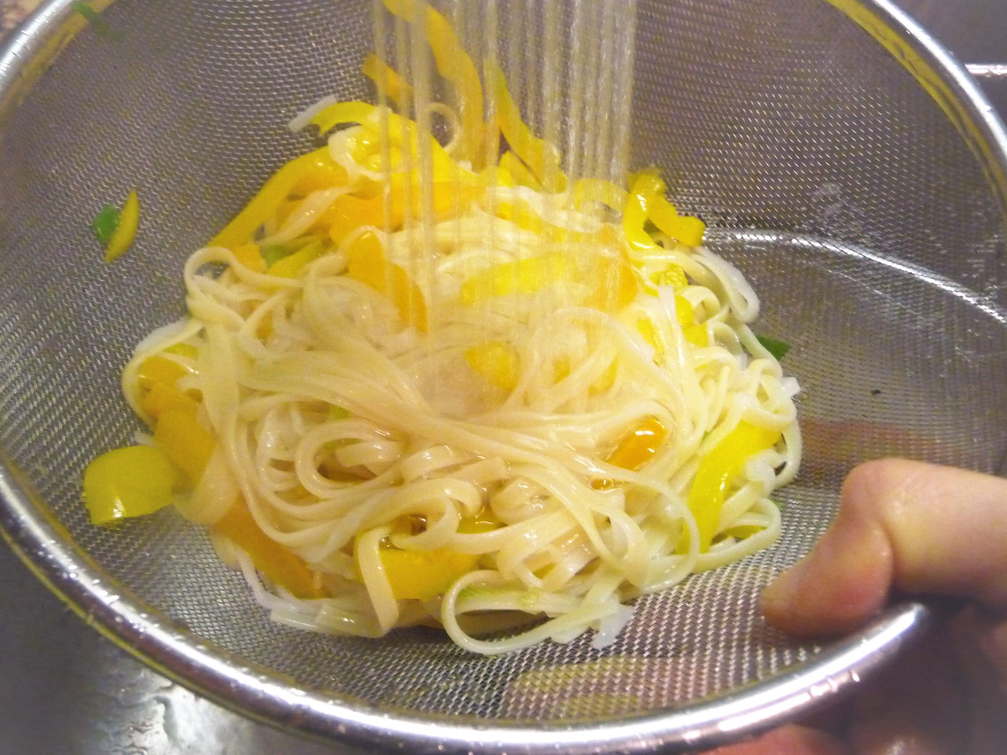 To cook the Brown Rice Noodles and Veggies: Cook noodles in the pot of boiling water, according to package directions. Leave them a little under-done, with a little “bite” in them. Add the sliced bell pepper and white parts of green onion during last minute of cooking. Drain noodles and peppers and immediately rinse under cold water to stop the cooking.