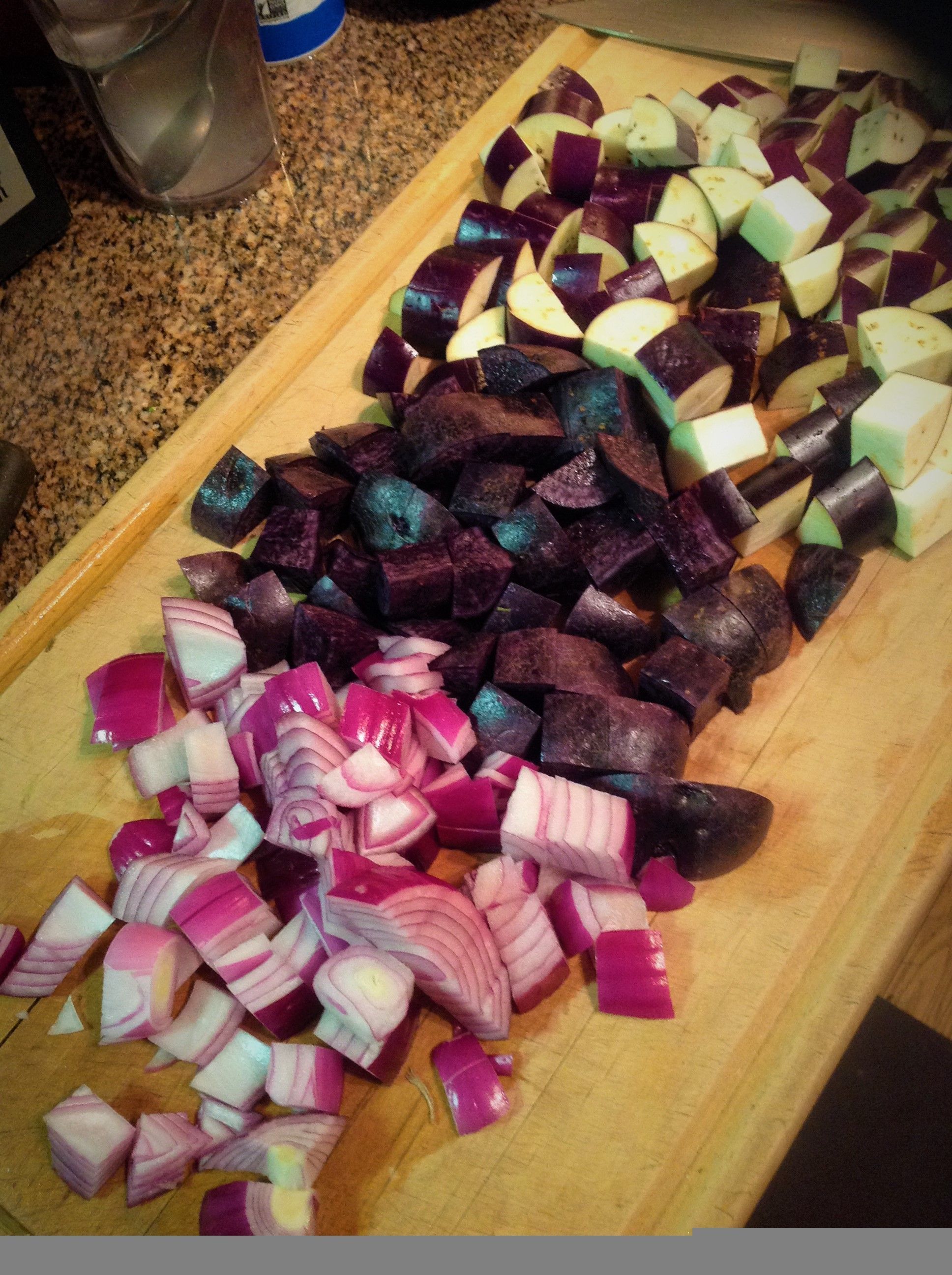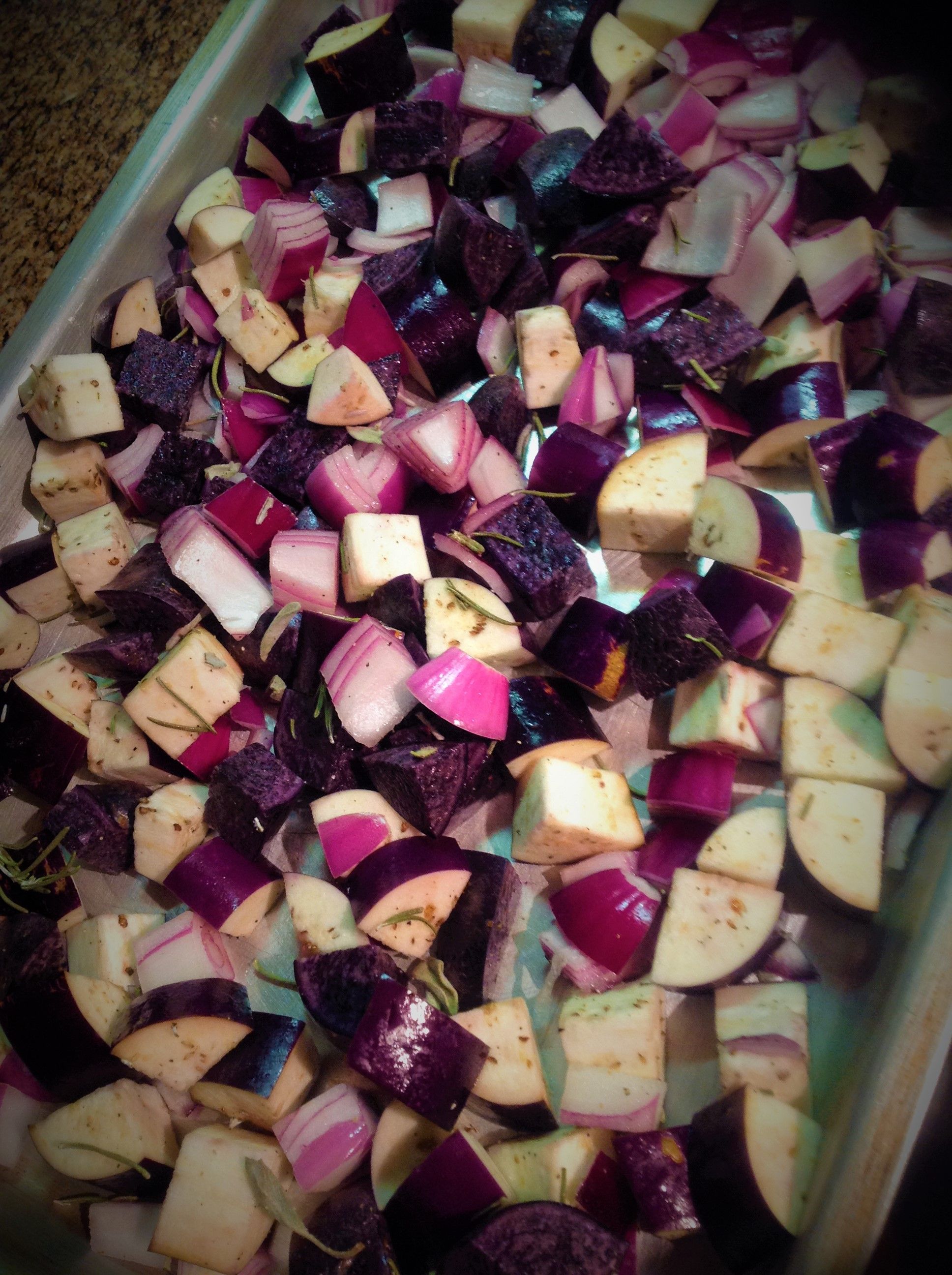 To prepare the Purple Potato Breakfast Hash: Spread the eggplant and potatoes into a single layer on the baking sheet. Sprinkle with the rosemary, sage, salt, and pepper.