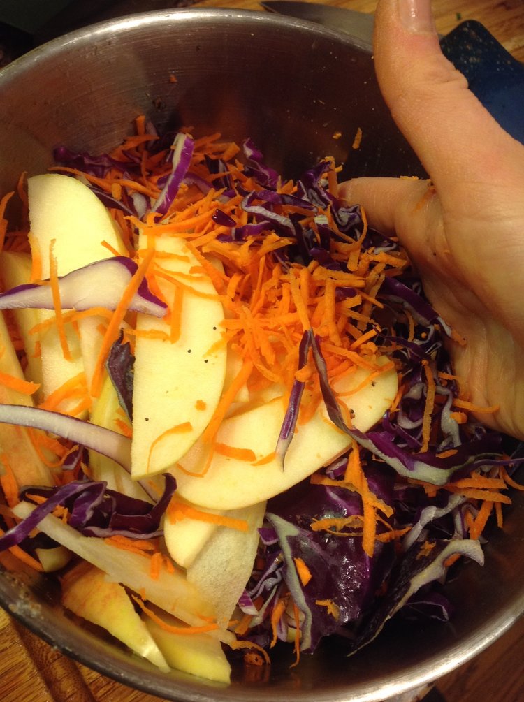 To make the Apple Cabbage Poppy Seed Slaw: While the dressing sets, prepare the other ingredients. Core and thinly slice the apple. Chop the parsley. Once the dressing has set, add the sliced apple, cabbage, carrots, and parsley. Use your hands to toss well, until thoroughly combined. Serve immediately.