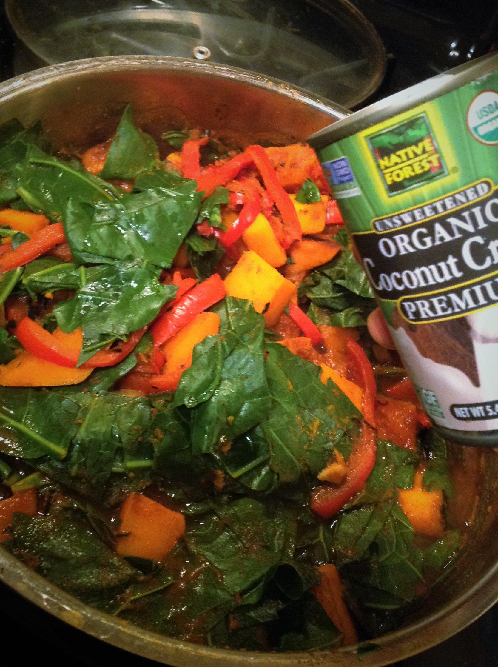 When the squash is tender, add the collard greens. Cover and cook just until greens wilt, only a minute or so. Stir in coconut cream. Taste to adjust seasoning.