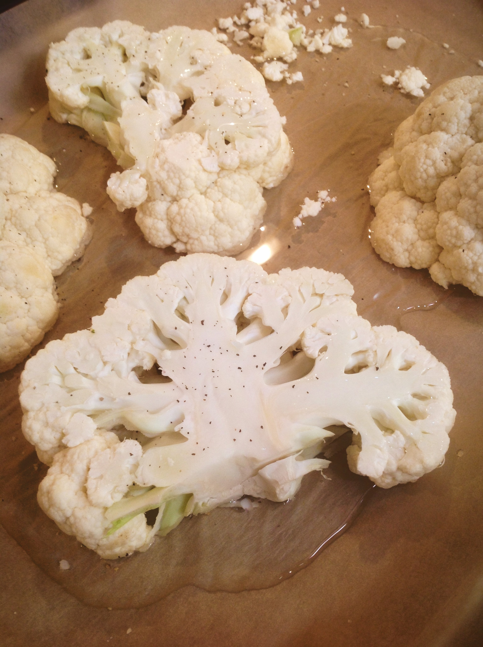 Place the cauliflower core-side-down on a cutting board. Slice the cauliflower into four 1-inch thick “steaks”. Place the steaks on the pre-lined baking sheet. Also, place any loose florets on the baking sheet.