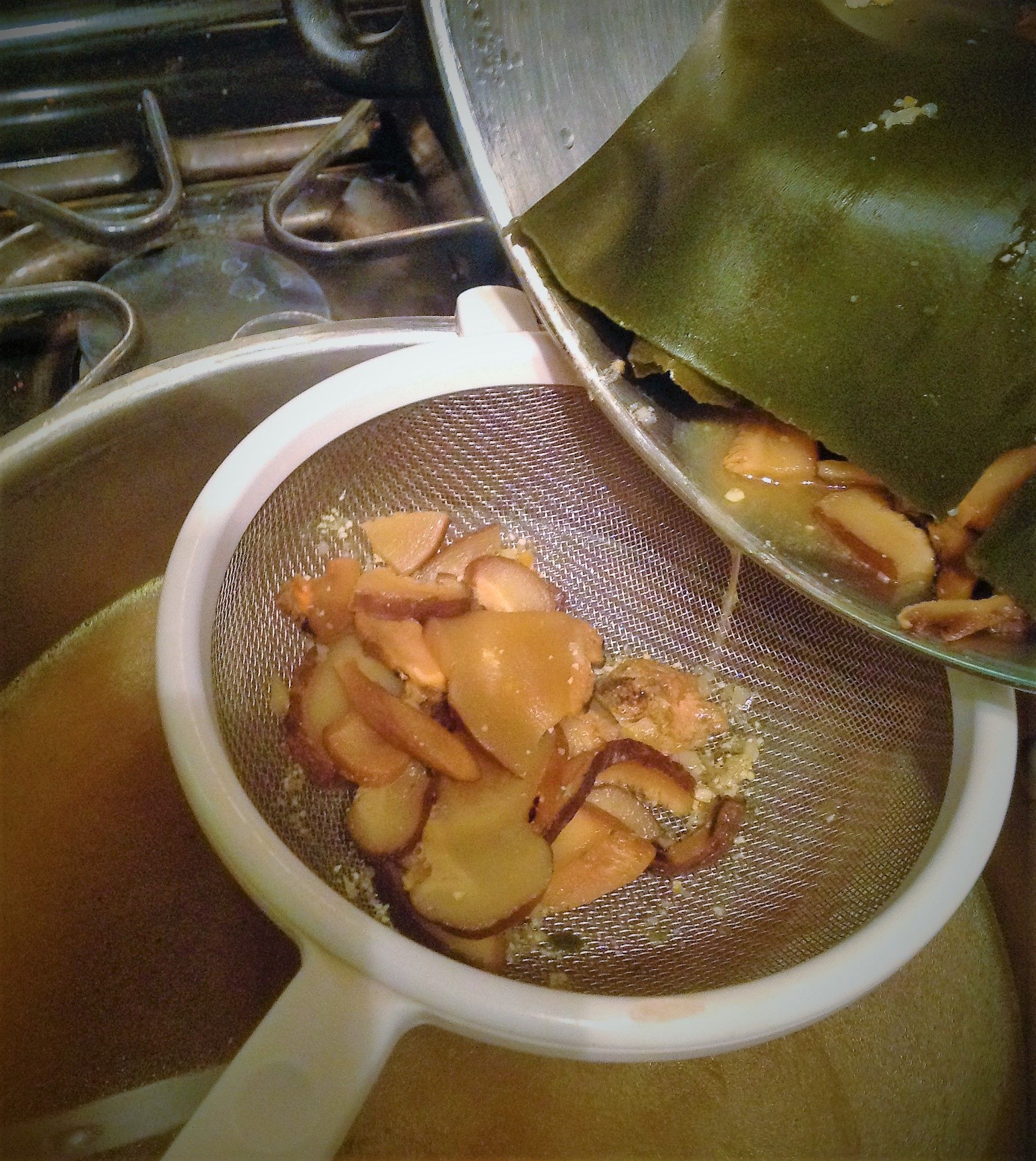 - When the dashi is done, turn off heat. Drain the dashi so you only have a broth. Discard the kombu mixture. Return the broth to low heat.