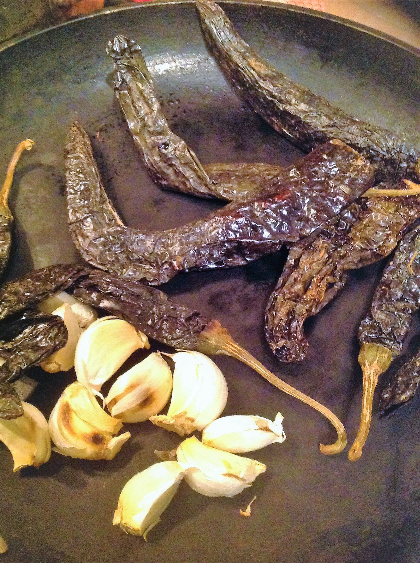 To toast the Pasilla Chilies: Place the pasilla peppers and garlic (in their peel) in a wide pan and toast over medium-high heat. Cook until the garlic peel is charred and the peppers start smelling and get poofy, 5-7 minutes.