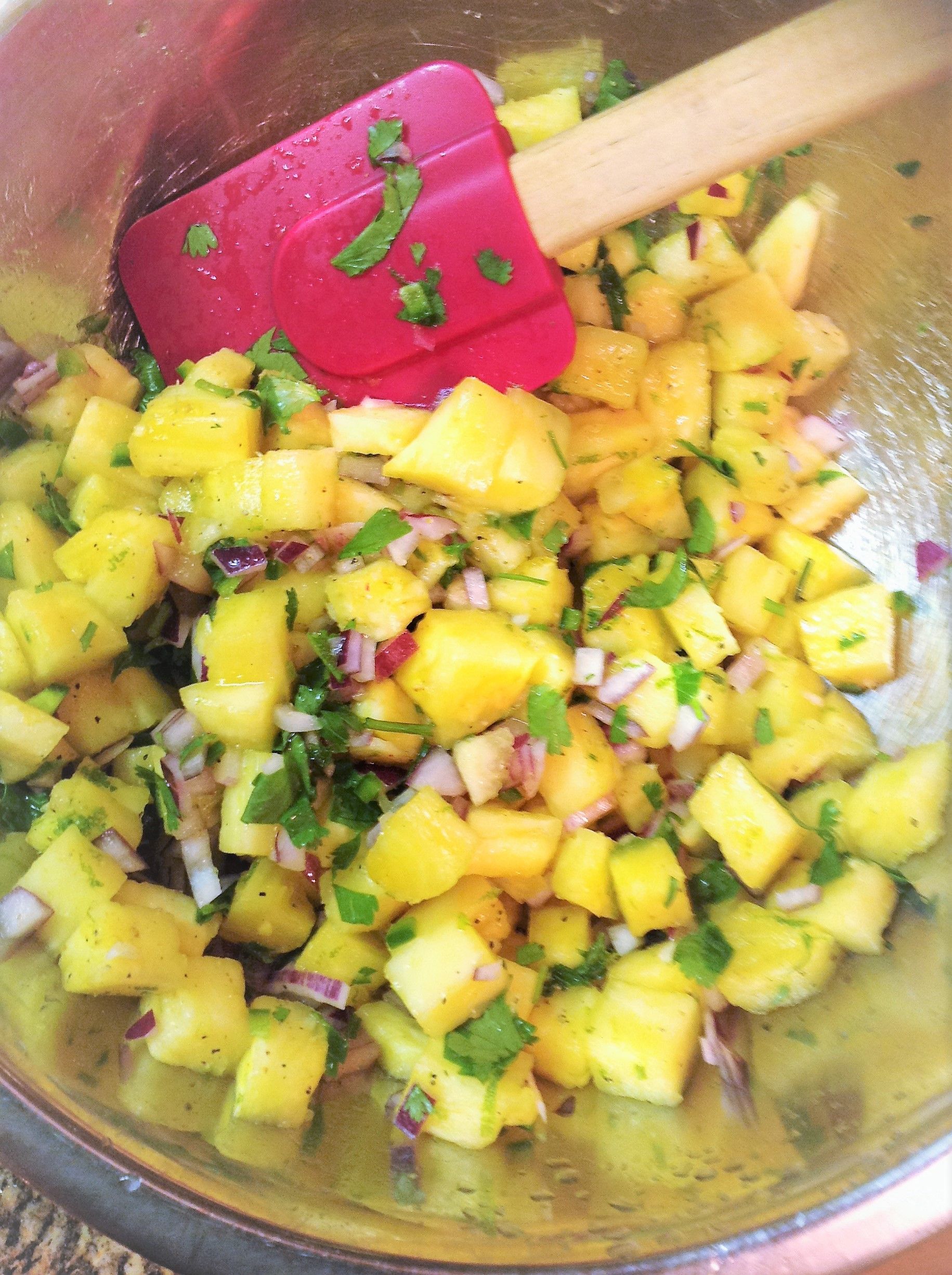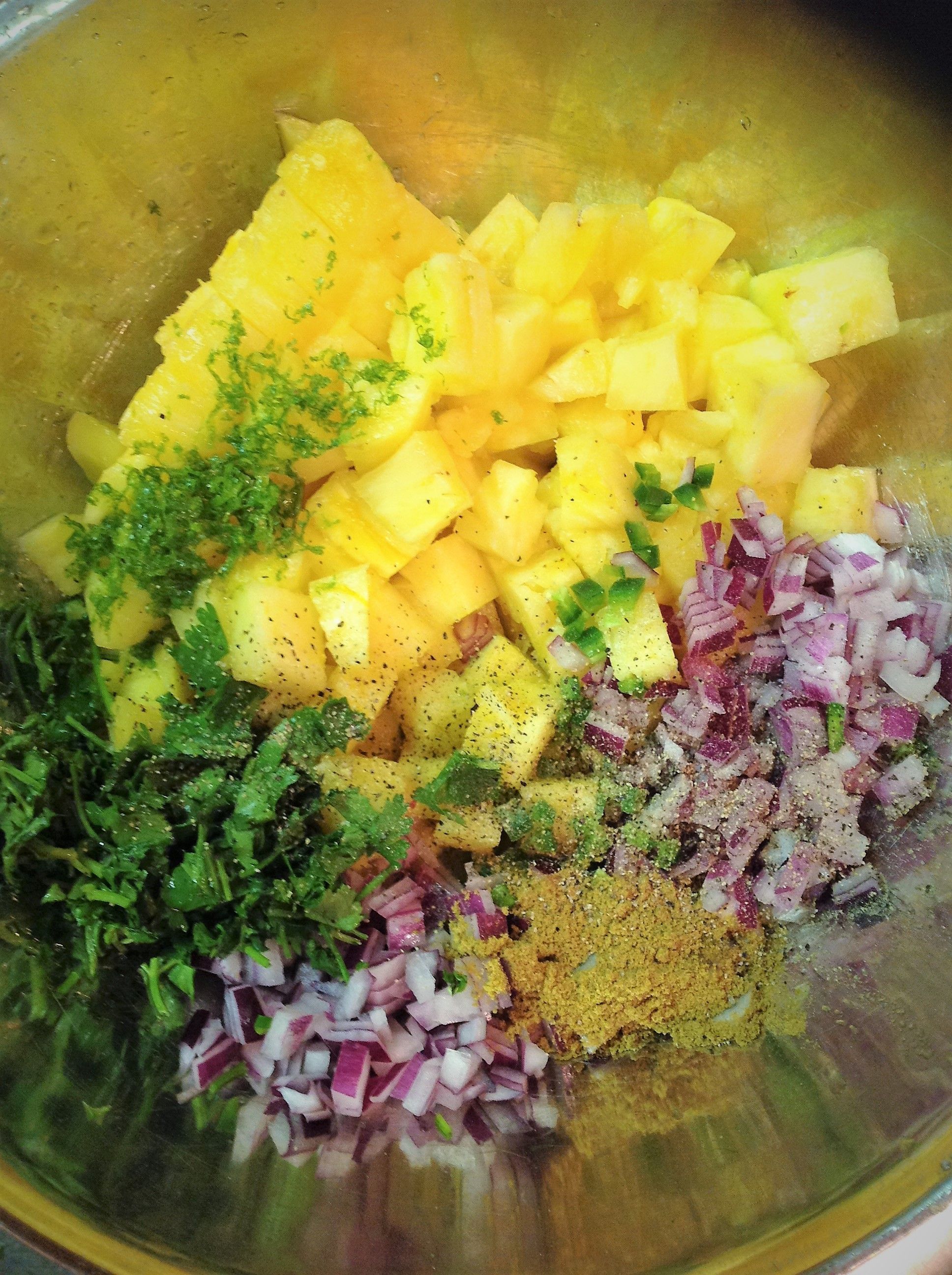 To Make the Spicy-Sweet Raw Pineapple Salsa: In a small bowl, combine the red onion, jalapeno, cumin, lime juice, and salt. Let sit while you chop the cilantro and dice the pineapple.