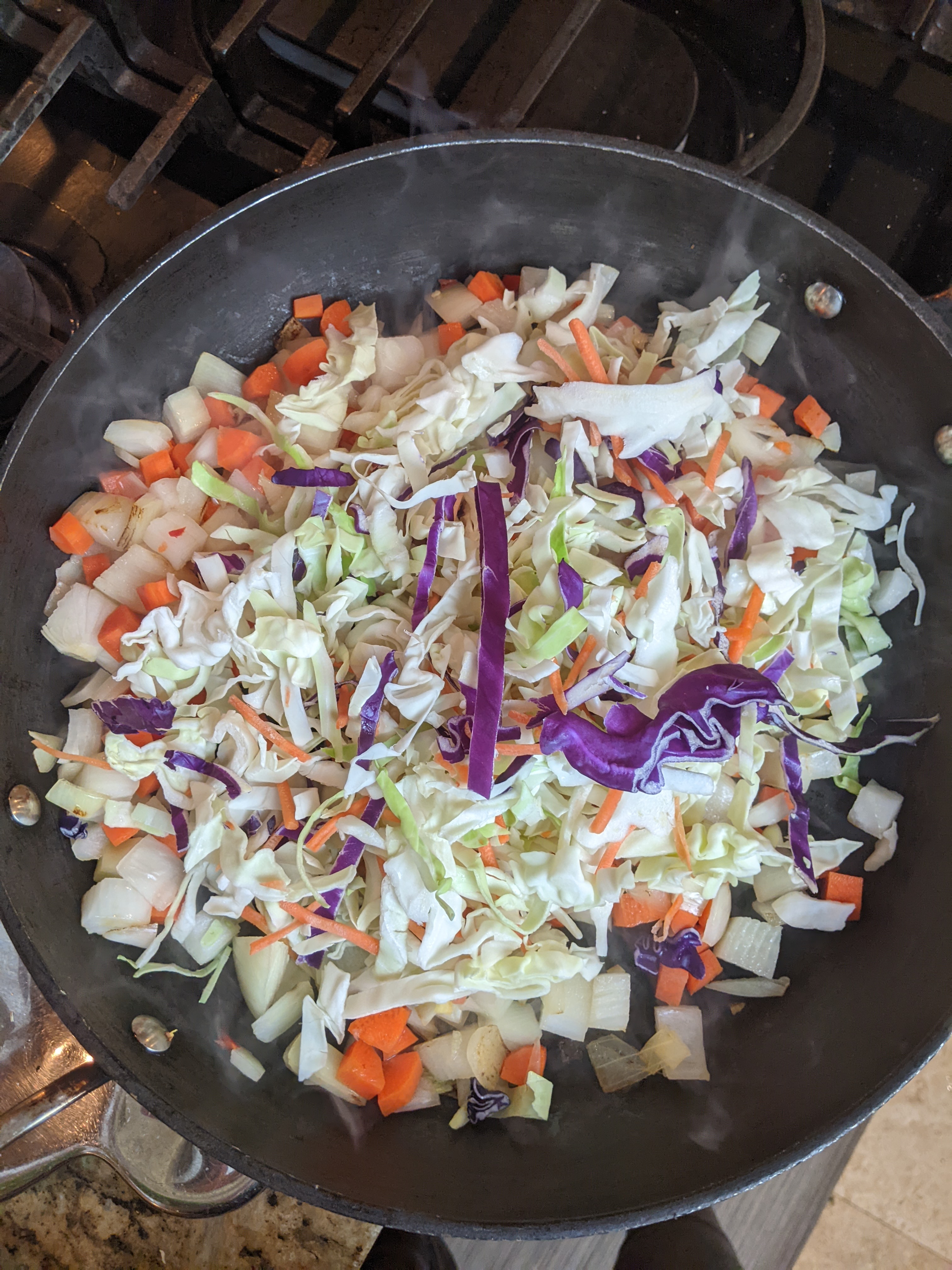 A whole foods, plant-based diet celebrates filling your plate with lots of colorful, nutritious vegetables. This is a great dish for adding veggies! The recipe below uses purple cabbage, green broccoli, and orange carrots. But, you can substitute or add other vegetables like brown mushrooms, yellow bell peppers, green beans, and purple carrots.