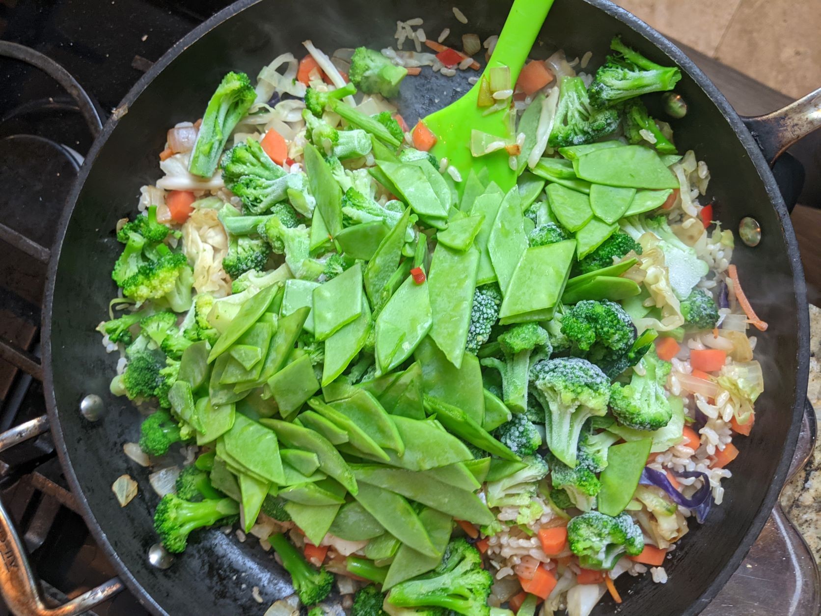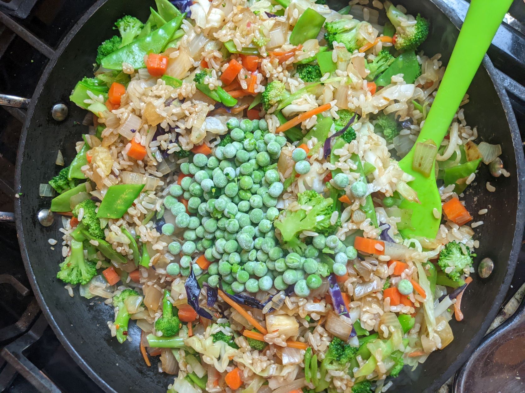 - Add the green vegetables: the frozen broccoli, snow peas, and frozen peas. Continue to stir-fry, stirring over high heat, until everything is hot.